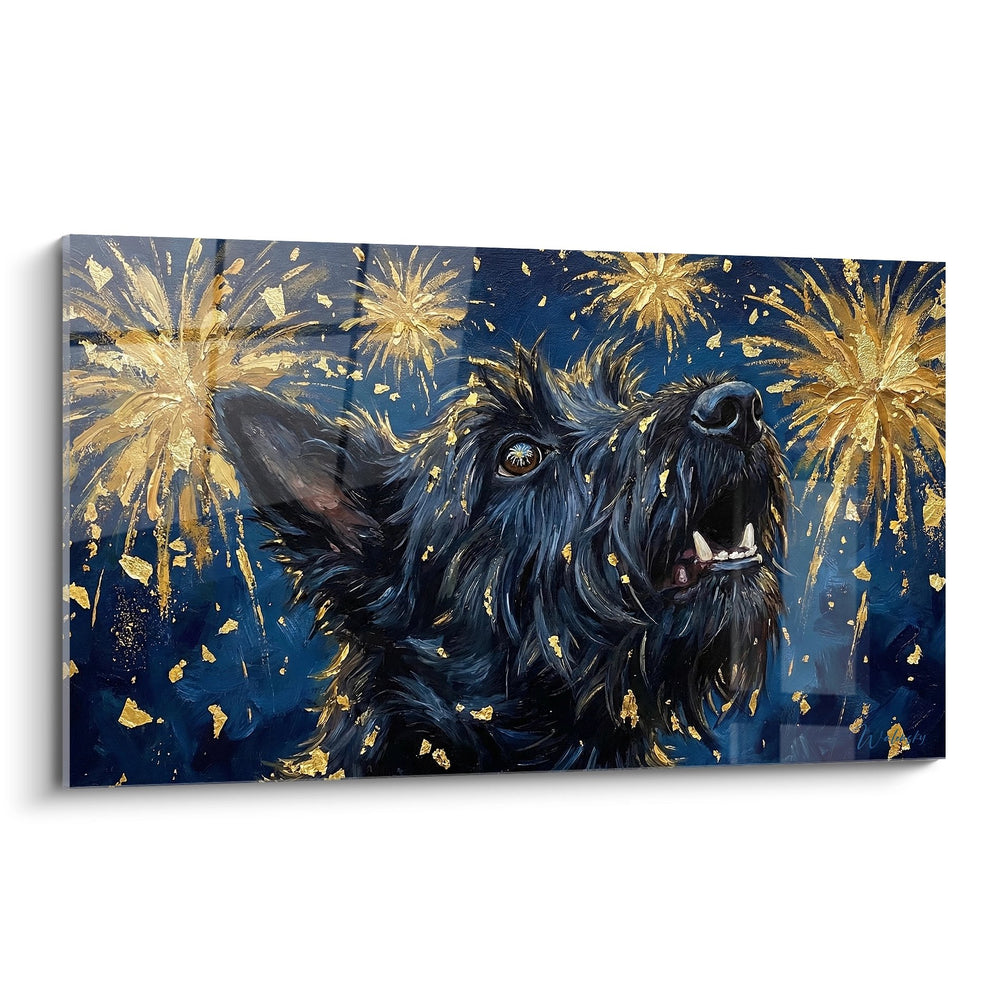 Schwarzer Hund mit goldenen Feuerwerken - Nächtliche Feier - Scottish Terrier Edition