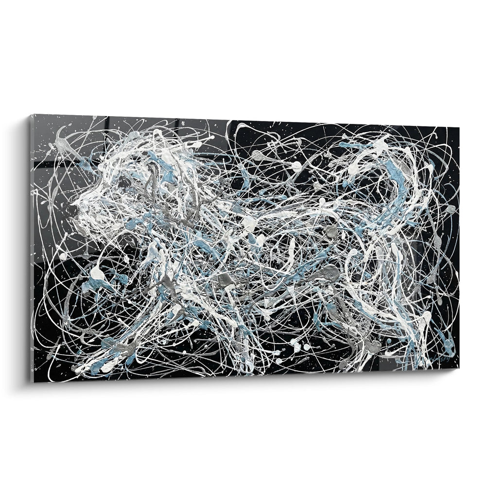 This abstract composition deploys an intense black background over which gesture projections of pure white and icy blue explode. The splashes wind and swirl in perpetual motion, creating spontaneous arabesques that evoke the Pyrenees Mountains. Silver-grey nuances enrich the palette, while azure touches bring crystalline freshness. The gestural technique generates varied textures, alternating between fine droplets and broad expressive flows. The whole reveals a perfect balance between controlled chaos and chromatic harmony, where each projection seems to capture the very essence of mountain torrent waters.