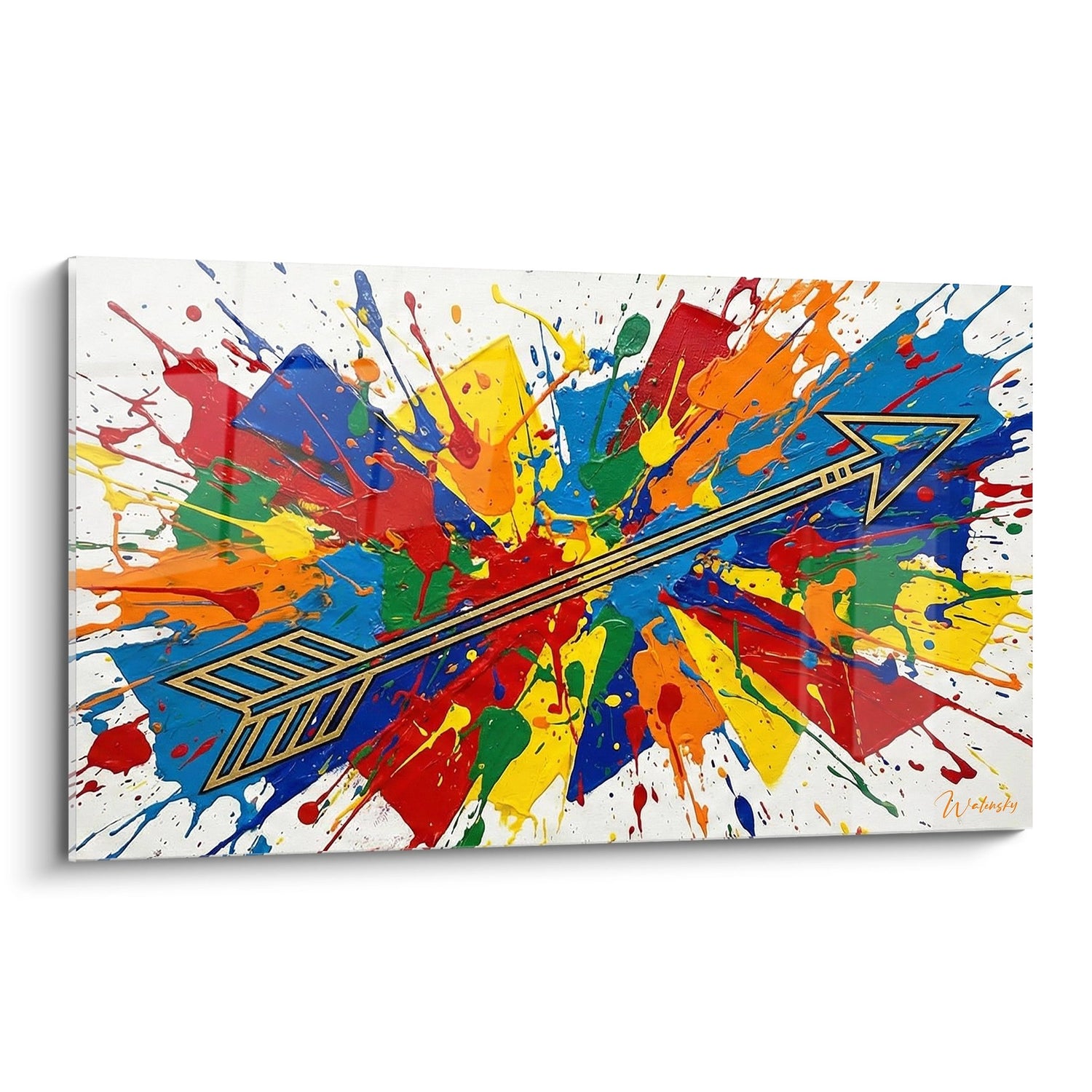 This striking painting captures the dynamic essence of archery through an artistic explosion of vibrant colors. At the center of this energetic composition, a golden arrow with precise geometric contours crosses a kaleidoscope of striking shades. Projections of red, blue, yellow, orange and green paint create a radial movement that evokes the power and speed of an arrow in full flight. This modern artwork transforms the frozen instant of shooting into a visual celebration of the archer and his art. The color splashes seem to explode from the central point, symbolizing the impact and precision sought in archery practice. The pure white background enhances this chromatic symphony, creating a striking contrast that immediately draws the eye. This unique artistic representation will appeal to both passionate archers and contemporary art lovers.