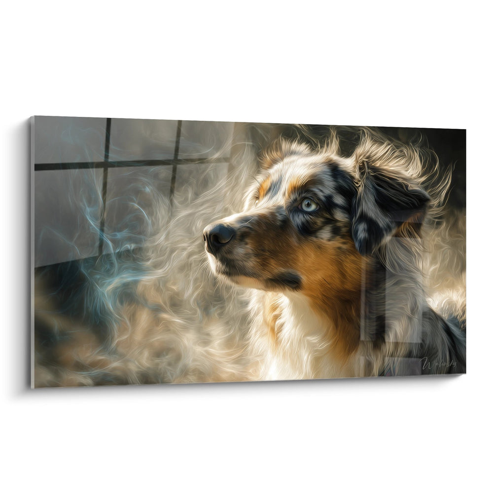 The smoky wisps surrounding the portrait create a mystical and dreamlike atmosphere. This artistic technique evokes movement, freedom of spirit, and the wild soul of the Australian Shepherd. These vaporous effects soften the composition while emphasizing the animal's noble character, transforming a simple portrait into a contemplative and poetic artwork.