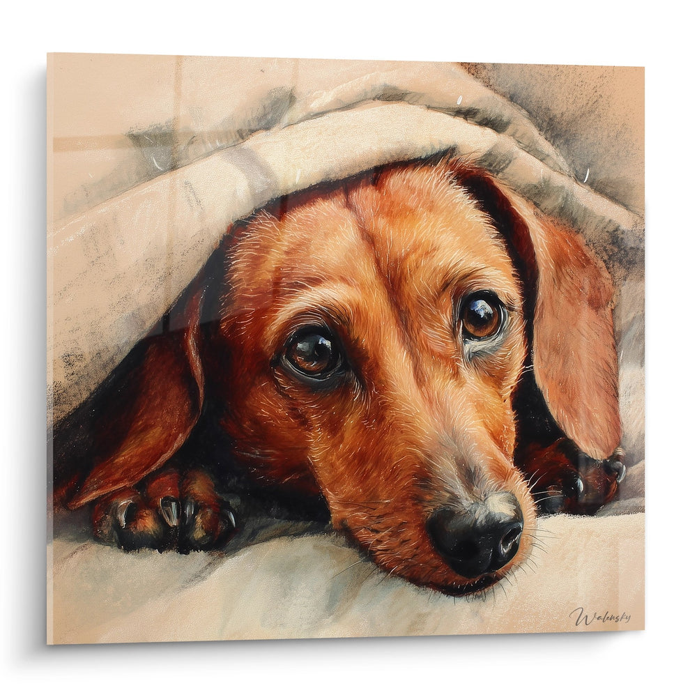 Absolutely, this artwork radiates extraordinary emotional warmth. The expressive gaze of the russet dachshund, its bright eyes slightly glistening with emotion and its posture nestled under the beige blanket create an atmosphere of security and tenderness. This artistic representation perfectly captures the intimacy of the moment when an animal seeks protection and comfort from its owners.