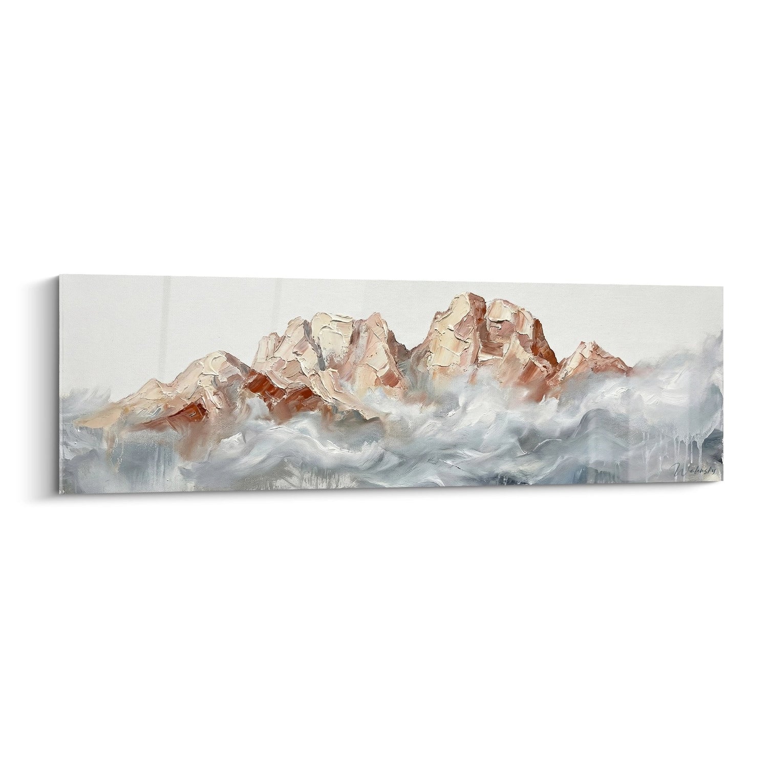 This striking artwork captures the mysterious majesty of mountain peaks emerging from an ocean of clouds. The painting features a panoramic composition where rocky summits rise proudly above a sea of mist, creating a landscape that is both dramatic and soothing. The artist has successfully conveyed this particular atmosphere of high altitudes, where the mountain seems to float between earth and sky. The sculpted reliefs reveal complex geological formations, reminiscent of the famous limestone walls of the Italian Dolomites. This panoramic wall painting will transform your interior into an open window onto alpine vastness, bringing a contemplative dimension and a sense of escape. The depth effect created by the different planes - from clouds in the foreground to distant peaks - invites reverie and mental escape to these pristine high mountain territories.