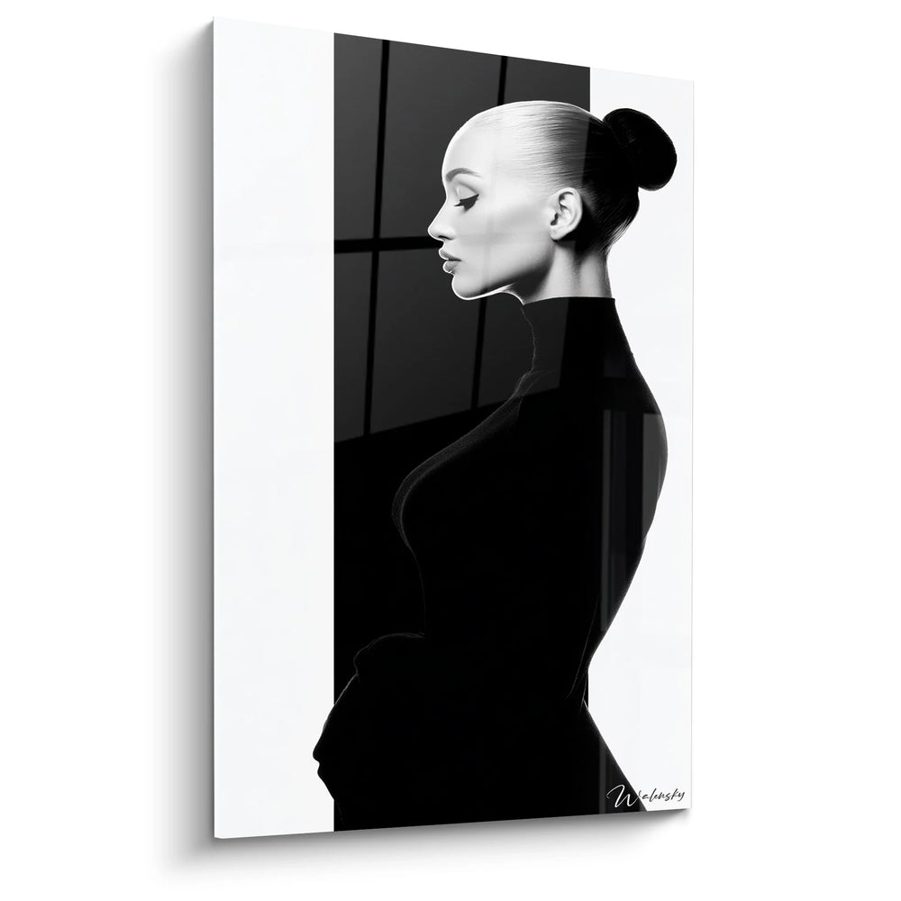This work belongs to the tradition of artistic portrait photography and recalls masters of fashion photography. The minimalist aesthetic evokes the creations of Irving Penn or Richard Avedon. This modern black and white painting also has roots in classical portrait art, reinterpreted with contemporary sensitivity that makes it a unique decorative piece.