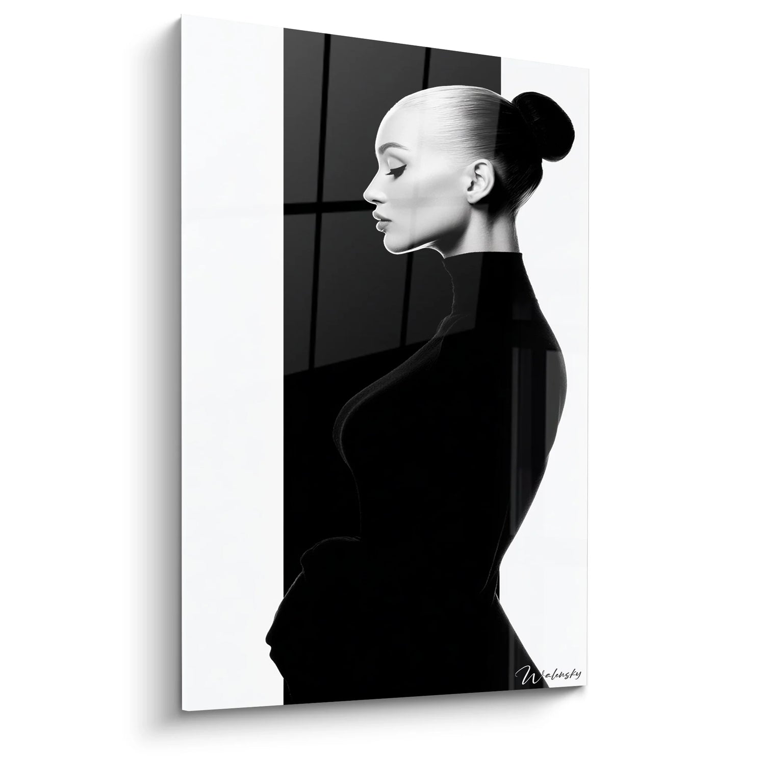 The monochrome palette of this elegant woman painting reveals the full expressive power of black and white. This modern wall decoration exploits contrasts to create intense emotional depth. The rightward-facing profile symbolizes the future and hope, while the facial serenity evokes inner peace and self-confidence.
