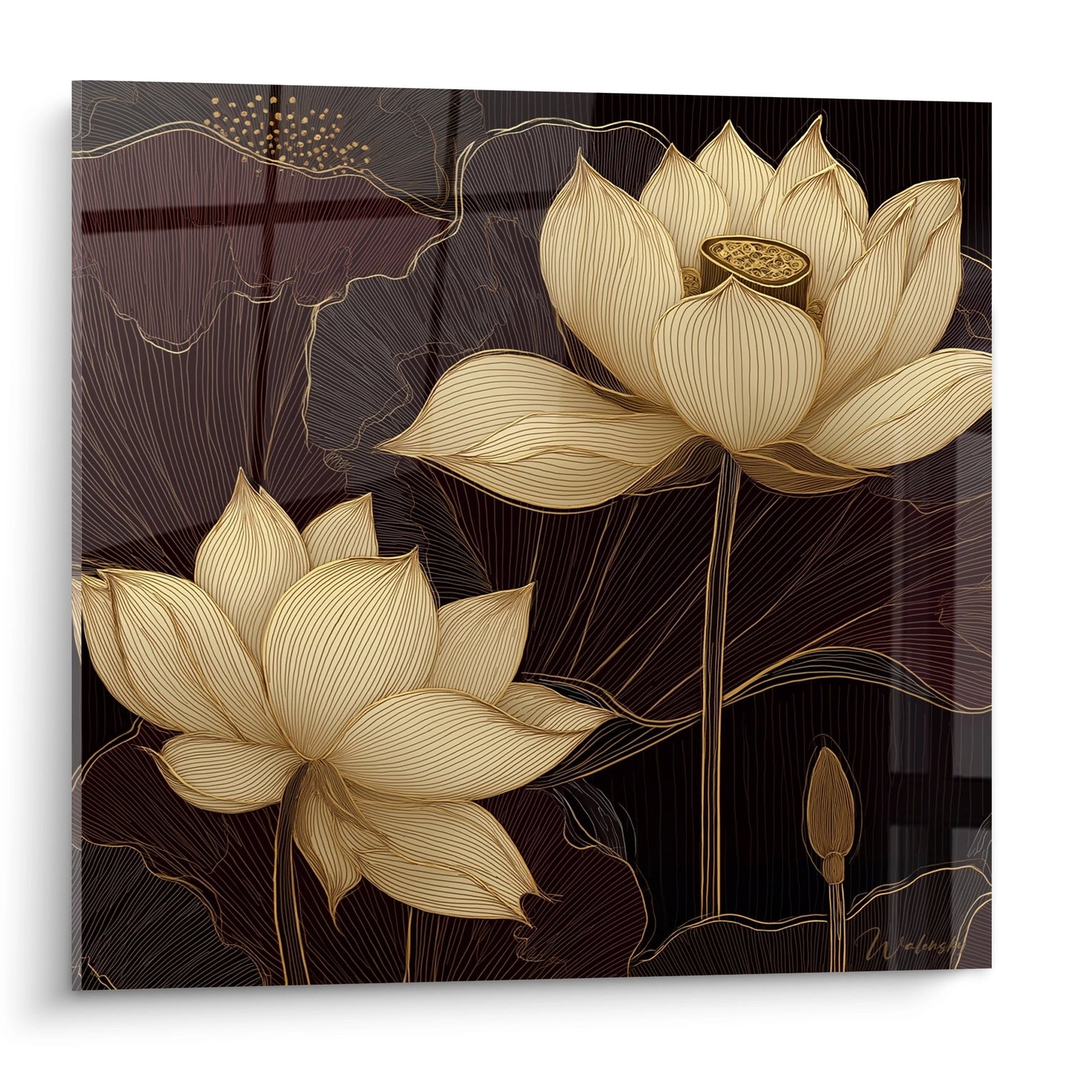 The color palette of this art deco wall art plays on the opposition between brilliant gold and deep burgundy tones. This harmonic balance evokes the richness and sophistication inherent to the art deco movement. Golden lotus flowers symbolize eternal beauty and wisdom, while dark shades bring mystery and depth to the overall composition.