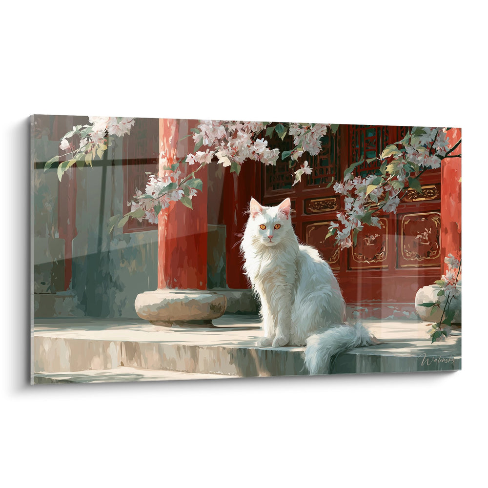 This captivating artwork features a majestic Turkish Angora cat with golden eyes, sitting gracefully before the entrance of a traditional Asian temple. The feline, with its immaculate and silky white coat characteristic of its breed, stands out harmoniously against the vermillion-red background of carved columns. The temple's architectural details, adorned with traditional decorative motifs, create an authentic and refined frame. Cherry blossom branches delicately frame the scene, their white and pink petals adding a touch of spring poetry. The soft light bathing the entire composition conveys a contemplative and peaceful atmosphere, evoking Oriental wisdom and the natural nobility of the Turkish Angora. This painting perfectly captures the innate elegance of this cat breed within a culturally rich environment symbolism.