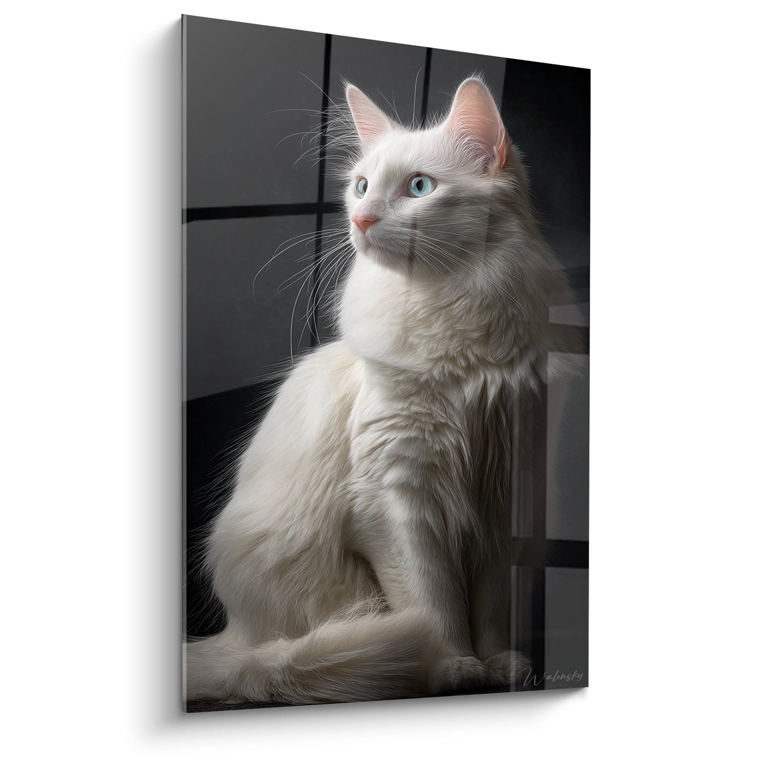 The chromatic palette of this work plays on subtle contrasts between the pure white of the coat and the gray nuances of the background. The odd eyes symbolize duality and uniqueness, characteristics prized in the Turkish Angora. This composition evokes purity, elegance and feline mystery, creating an atmosphere that is both soothing and captivating.