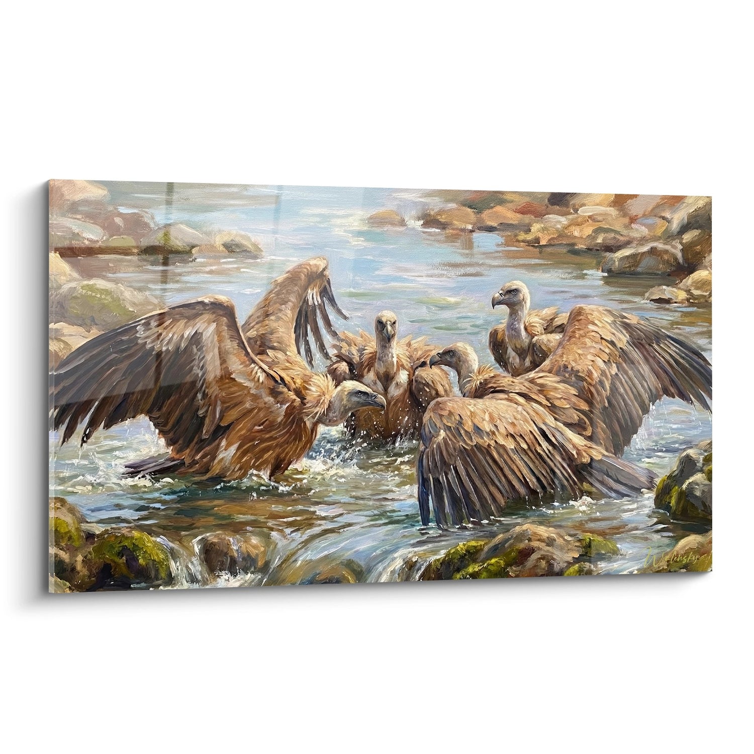 This dynamic composition reveals a group of vultures with majestically spread wings, gliding through the crystalline splash of the rapids. The color palette unfolds in warm brown tones and golden ochres, enhanced by the coppery reflections of mature plumage. The blue hues of the water harmoniously contrast with the richness of the feathers, creating a striking visual balance. The painting technique reveals every detail with precision: suspended droplets, mossy rocky textures and natural luminosity that caresses each feather. The whole exudes raw energy, captured in a moment of wild authenticity where these majestic raptors reveal their natural grace.