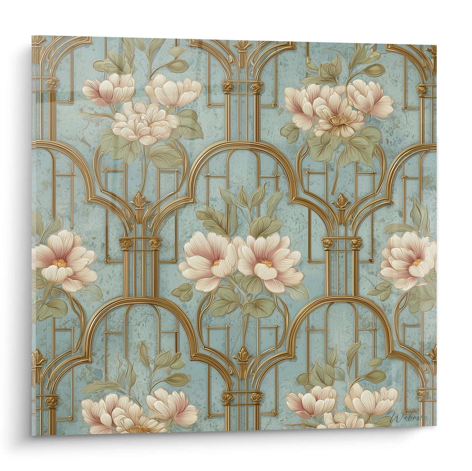 La peonia, fiore emblematico di prosperità e onore, simboleggia la ricchezza e la nobiltà di spirito. Le arcate dorate evocano l'architettura sacra e la grandezza, mentre il turchese apporta serenità e raffinatezza. Questa palette cromatica sofisticata - alleanza dell'oro luminoso, del turchese calmante e dei rosa polverosi - crea un'atmosfera al contempo maestosa e delicata, perfettamente rappresentativa dell'estetica art déco.