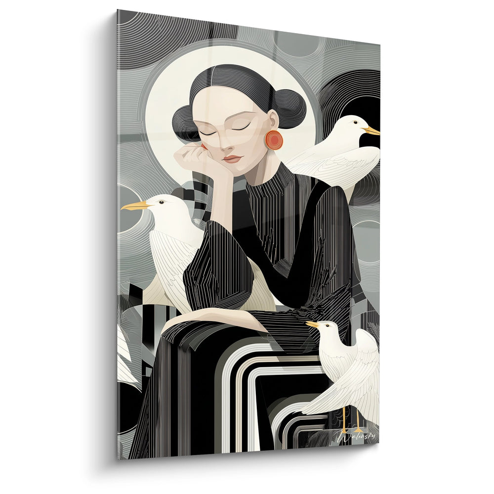 Questo affascinante quadro art déco presenta una composizione armoniosa che mescola eleganza femminile e simbolismo ornitico. L'opera ritrae una donna dai tratti delicati, pettinata nello stile caratteristico degli anni Venti, in una posa meditativa contemplativa. I suoi occhi chiusi e la mano delicatamente posata contro il viso evocano serenità e introspezione. La figura femminile è elegantemente circondata da tre uccelli bianchi dai becchi dorati, creando un dialogo poetico tra l'umano e la natura. Lo stile grafico adotta i codici estetici dell'art déco con le sue linee geometriche fluide, i motivi a spirale e i contrasti cromatici marcati. La tecnica dell'illustrazione vettoriale moderna reinterpreta brillantemente lo spirito decorativo degli anni ruggenti, offrendo una visione contemporanea di questo movimento artistico emblematico. I dettagli raffinati, come gli orecchini circolari rosso-arancioni e le righe geometriche dell'abbigliamento, testimoniano una ricerca estetica approfondita caratteristica dell'epoca art déco.