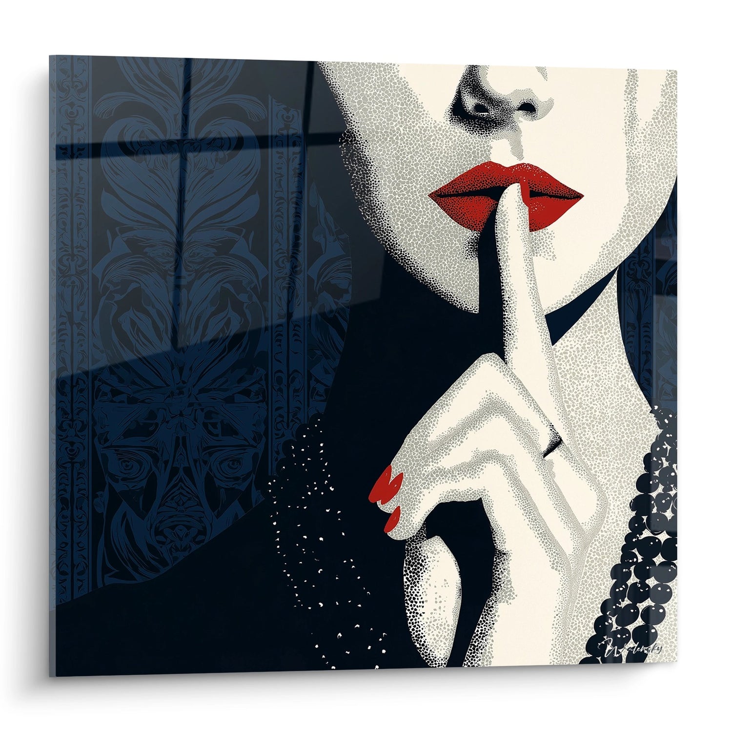 La palette cromatica ristretta ma incisiva associa il nero profondo, il bianco perlaceo e il rosso vermiglio delle labbra e delle unghie. Questi colori emblematici dell'eleganza parigina creano un contrasto affascinante e conferiscono all'opera una dimensione drammatica. Il gesto del silenzio evoca il mistero, la confidenzialità e la seduzione femminile, temi ricorrenti dell'Art déco.