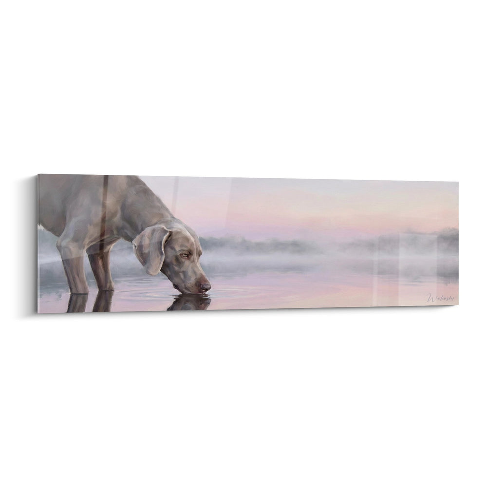 Quadro Bracco di Weimar che Beve sulla Spiaggia al Tramonto - Riflessi Dorati - Edizione Bracco di Weimar