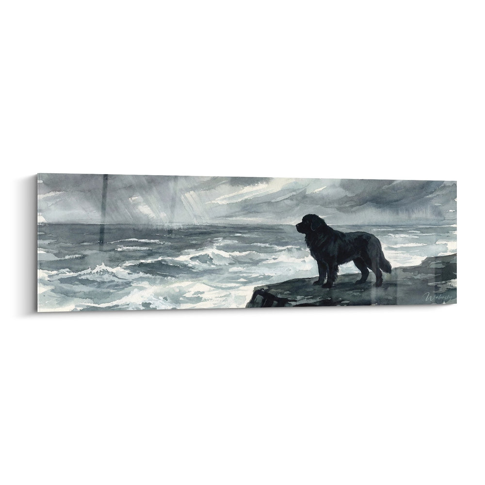 Questa postura maestosa incarna la saggezza e la serenità di fronte agli elementi scatenati. Il cane, eretto fiero sul suo promontorio roccioso, evoca la fedeltà incrollabile e il coraggio tranquillo. Questa scena cattura l'essenza stessa del Terranova: un protettore naturale delle acque, capace di mantenere la calma anche nella tempesta.