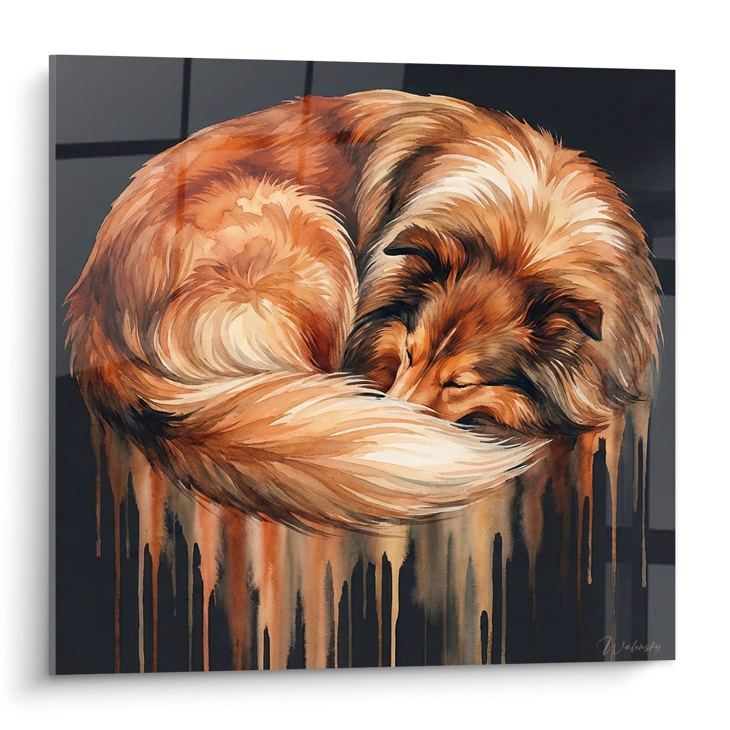 L'effet de coulure crée une transition poétique entre le réalisme du pelage et l'abstraction des tons qui s'étalent. Cette technique artistique évoque la fluidité du rêve et la douceur du sommeil. Les nuances cuivrées qui s'étalent vers le bas suggèrent que la chaleur de l'animal se diffuse dans l'espace, amplifiant l'effet cocooning de l'œuvre.