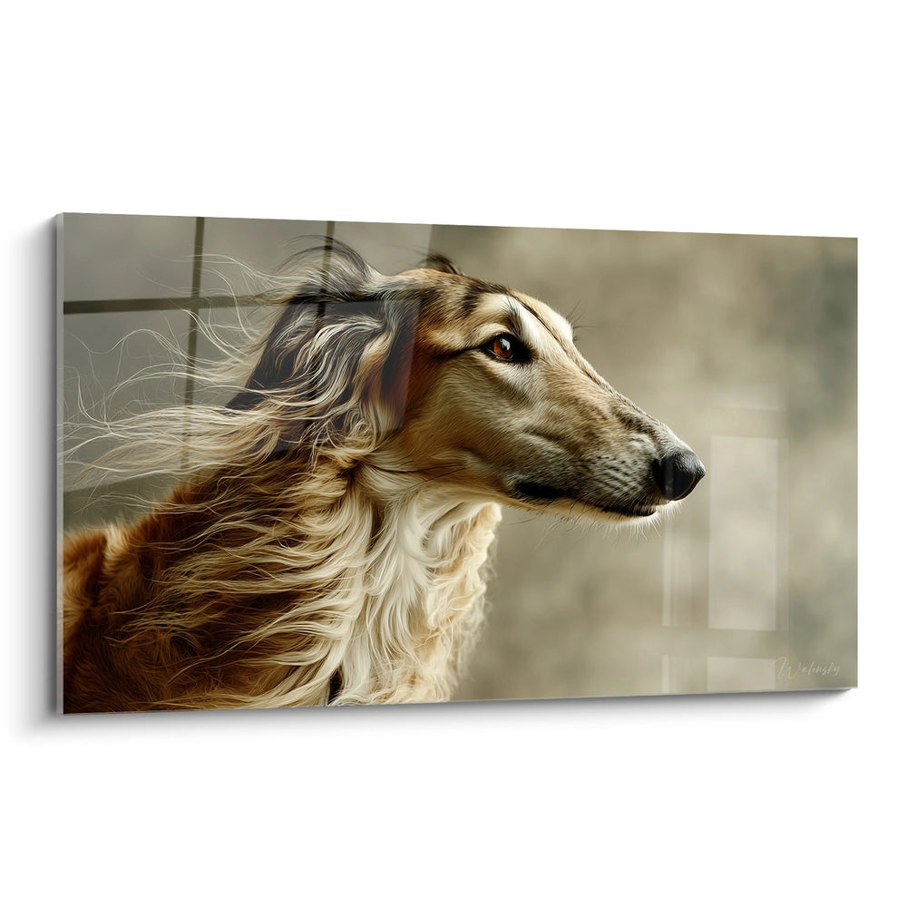 Questo ritratto rivela un'espressione contemplativa e serena piuttosto che intimidatoria. Lo sguardo di questo Barzoi, rivolto verso l'orizzonte, evoca meditazione e tranquillità. Questa atmosfera pacifica lo rende una scelta perfetta per camere da letto, salotti lettura o spazi di rilassamento dove si ricerca una presenza rassicurante e nobile.