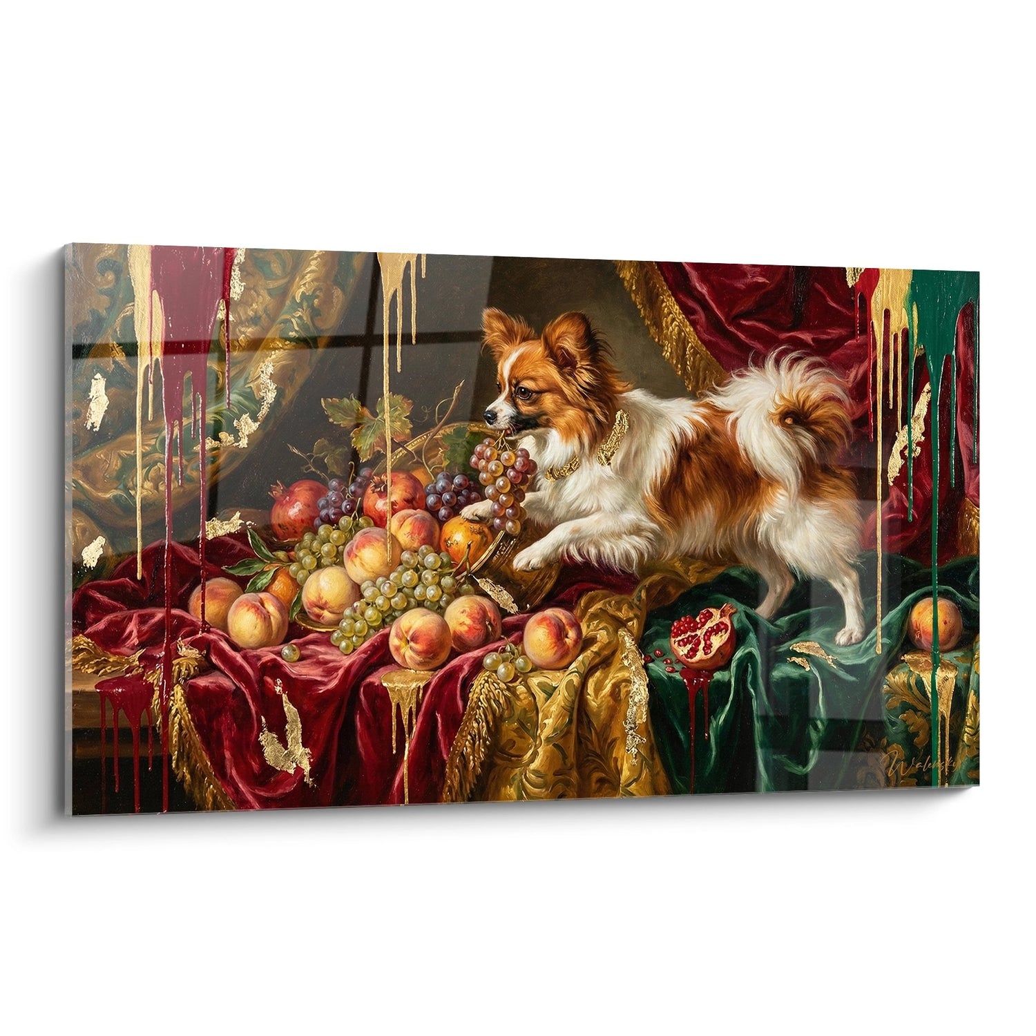 Quadro Cane Papillon con Frutta Barocca - Natura Morta Opulenta - Edizione Cane Papillon