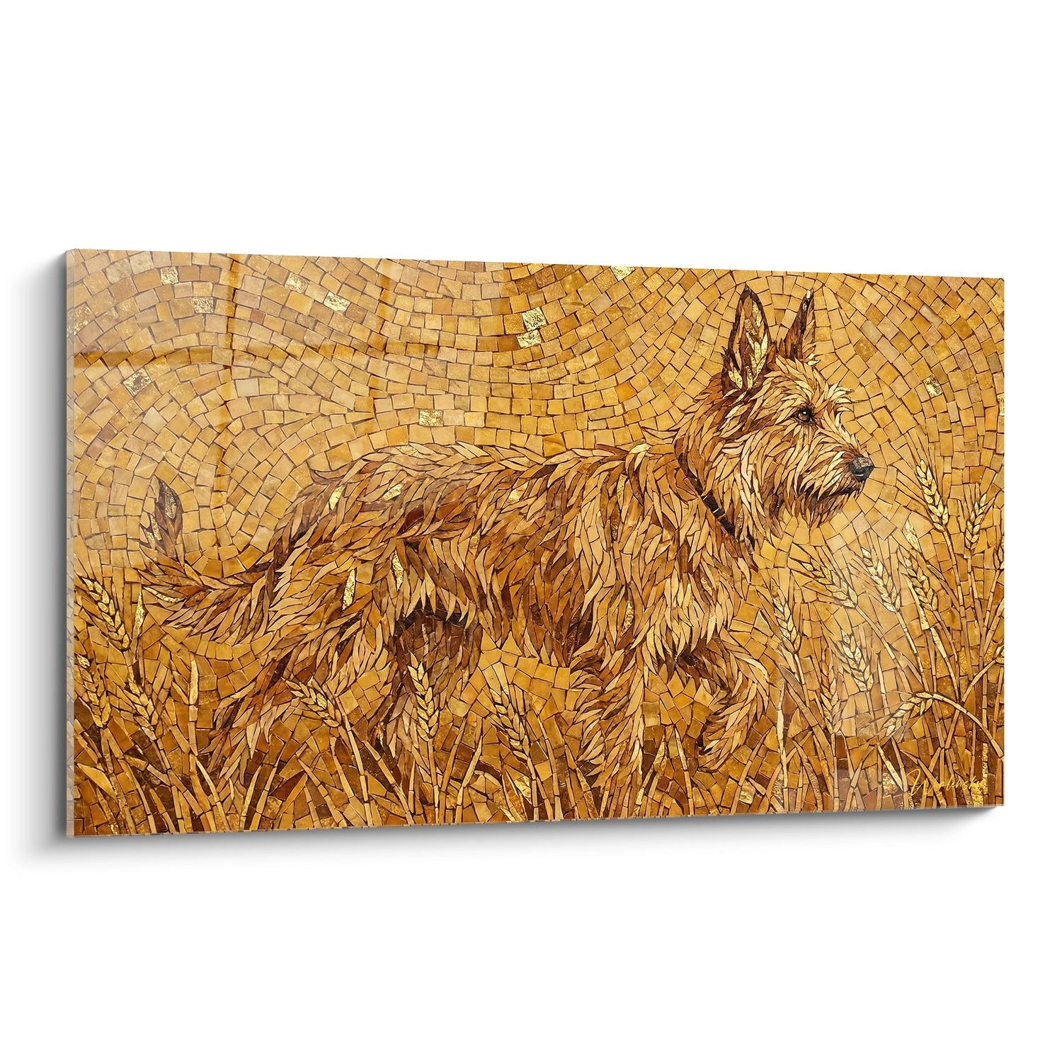 Questa opera si ispira all'arte bizantina con la sua tecnica di mosaico a tessere dorate. I piccoli quadratini creano un effetto di materia unico che sublima il mantello fulvo del cane e le spighe di grano, ricordando i mosaici delle basiliche antiche con un approccio contemporaneo.
