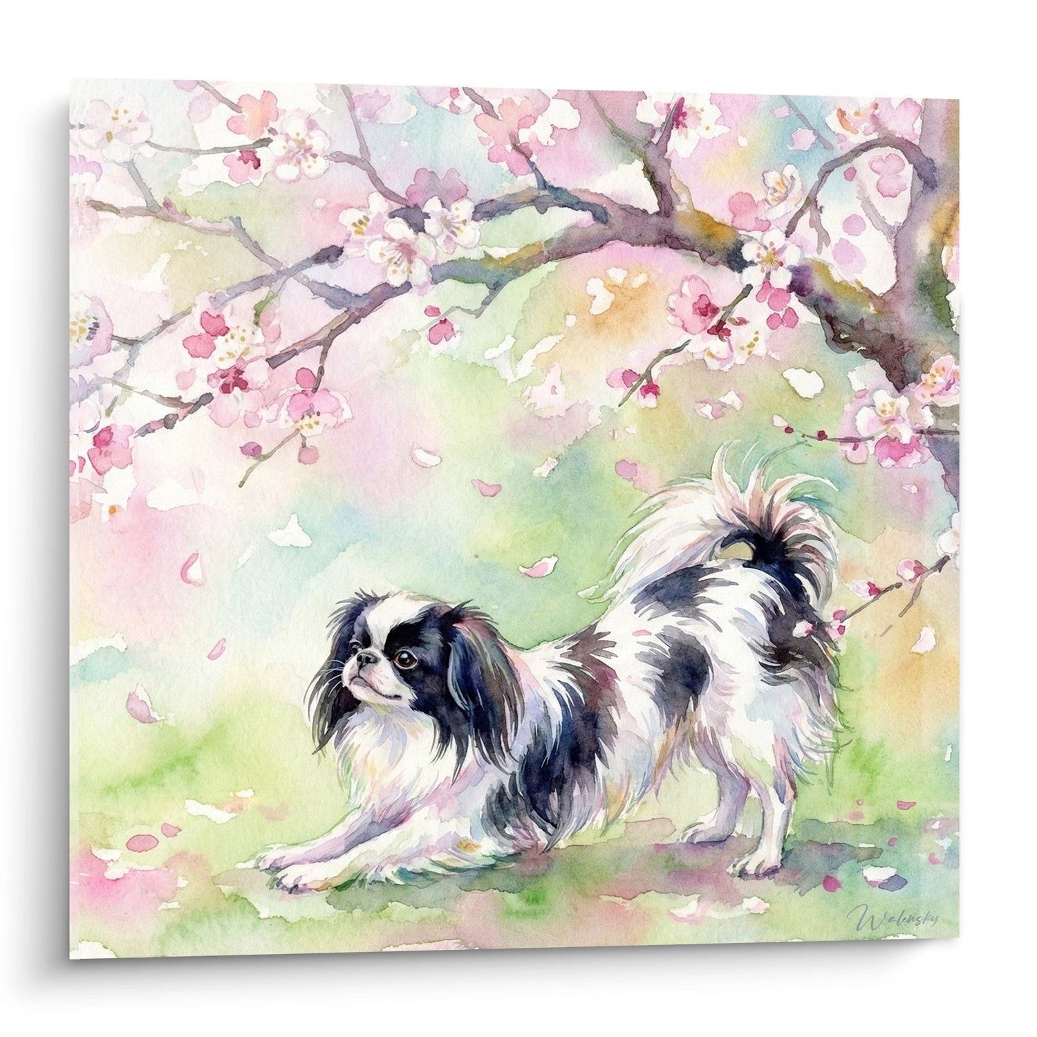 Tableau Aquarelle Chien Noir et Blanc sous Cerisiers en Fleurs - Douceur Printanière - Edition Epagneul Japonais