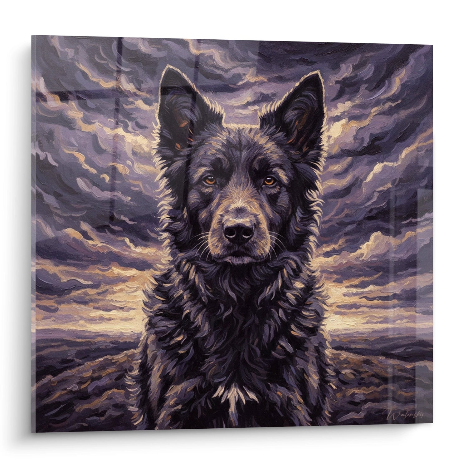 Tableau Mudi noir aux yeux ambrés sur fond de ciel tumultueux violet - Regard intense - Edition Mudi