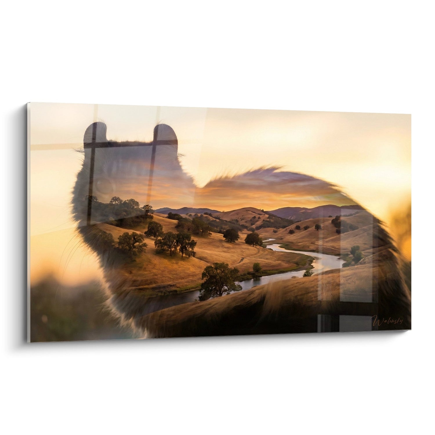 Quest'opera d'arte murale eccezionale presenta un gatto American Curl in una composizione artistica affascinante, dove la silhouette felina si fonde armoniosamente con un paesaggio pastorale immerso nella luce dorata del tramonto. L'American Curl, riconoscibile dalle sue orecchie caratteristiche arricciate all'indietro, sembra contemplare serenamente la valle ondulante attraversata da un fiume sinuoso. Il paesaggio rivela colline dorate cosparse di alberi maestosi, creando un'atmosfera di tranquillità e connessione profonda con la natura. Questa doppia esposizione artistica cattura l'essenza mistica del gatto American Curl mentre celebra la bellezza dei grandi spazi naturali. I contorni delicati del profilo felino s'integrano perfettamente alle curve naturali del terreno, simbolizzando l'armonia tra l'animale domestico e il suo ambiente selvaggio ancestrale. Questa rappresentazione unica del gatto American Curl trasforma un semplice ritratto animale in una meditazione visuale sulla contemplazione e la serenità.