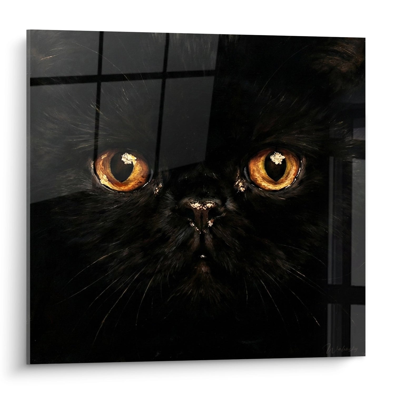 Imponi una presenza misteriosa e raffinata nel tuo ambiente con questo quadro che cattura lo sguardo appena si entra nella stanza. Il mantello nero profondo contrasta con occhi ambra di un’intensità quasi luminosa, come due soli dolci che sembrano seguire ogni tuo movimento.