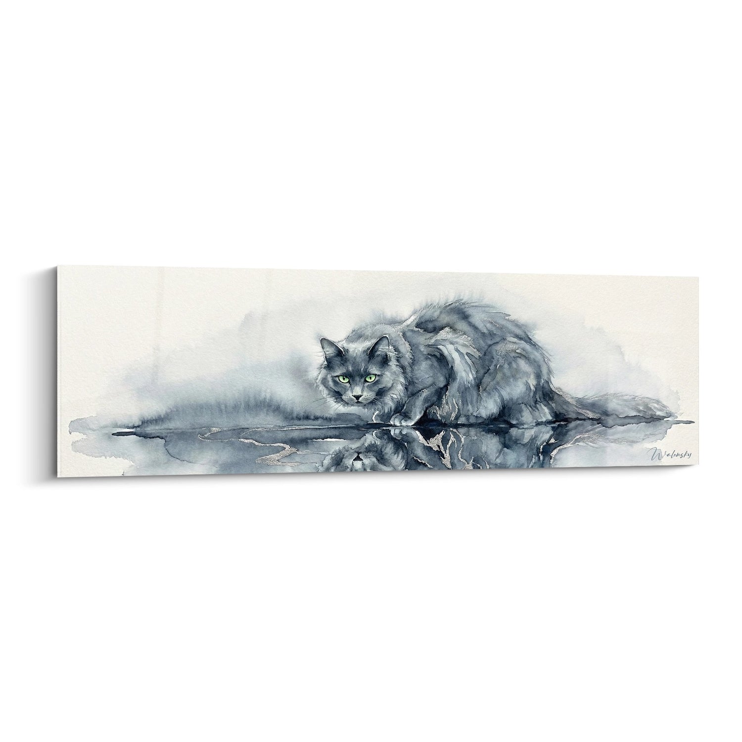Porta nella tua casa un elemento che trasmette eleganza e tranquillità. Questo quadro "Riflessi Pacifici" raffigura un gatto Nebelung con riflessi argentati, realizzato ad acquerello con una delicatezza rara. Ogni tocco di colore cattura la luce come una carezza, trasformando il tuo muro in un istante sospeso.