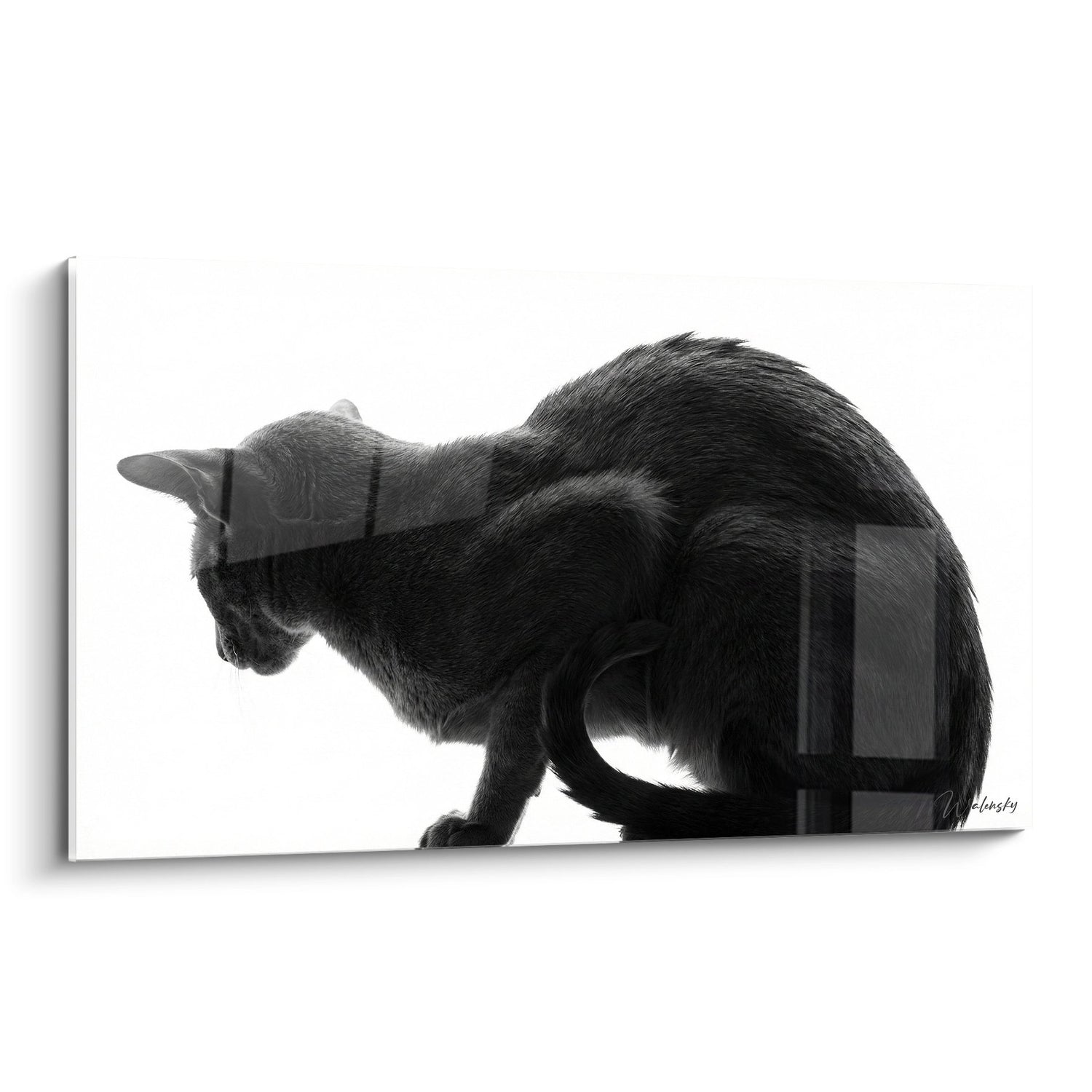 La scelta del bianco e nero conferisce a quest'opera un'atemporalità e una sofisticazione notevoli. Questa palette monocromatica simboleggia l'equilibrio perfetto tra luce e ombra, creando un'atmosfera zen e rilassante. La silhouette scura del gatto si stacca magnificamente su sfondo chiaro, evocando la dualità e l'armonia dei contrari.