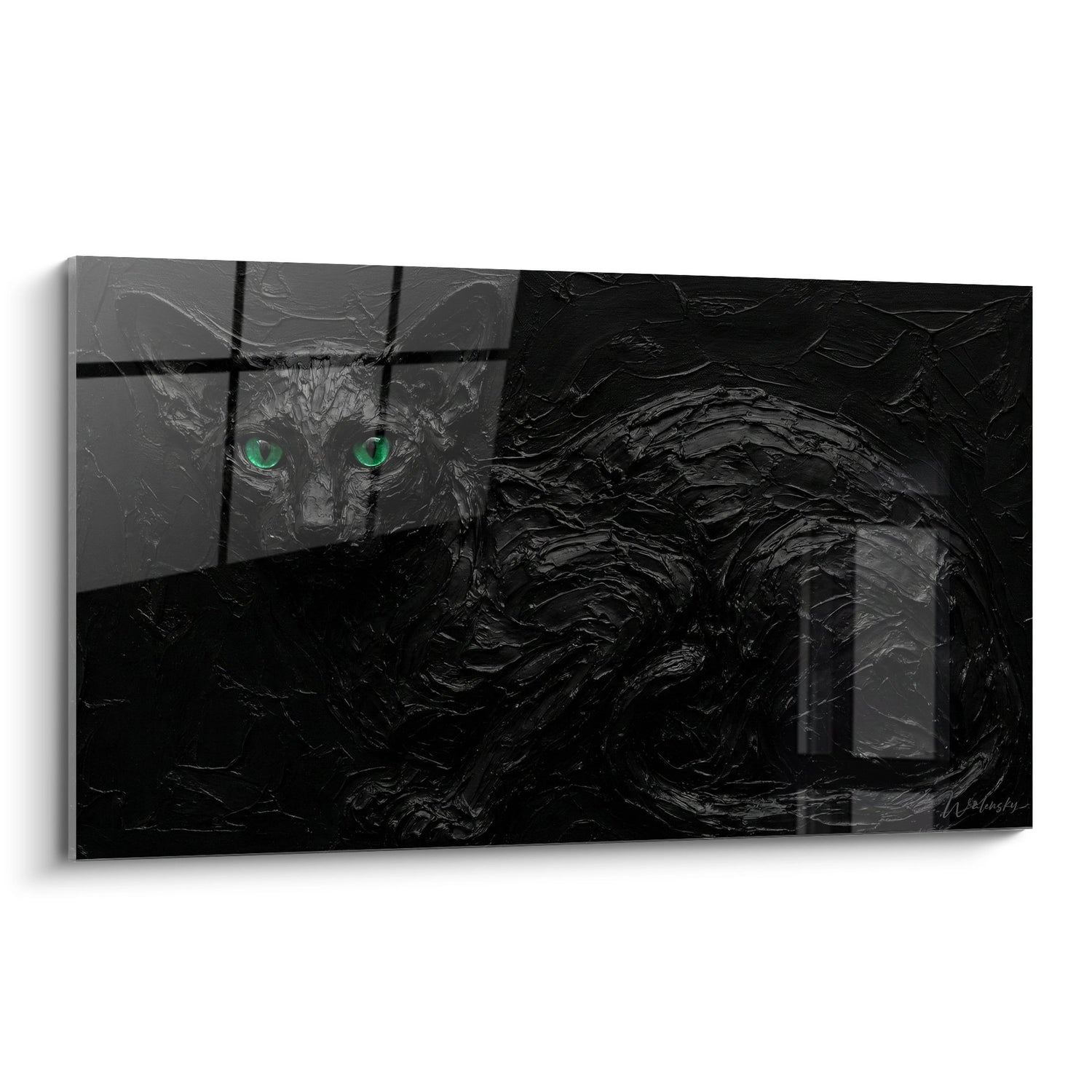Immagina di entrare nel tuo salotto: la luce soffusa accarezza i contorni della cornice, il pelo nero sembra assorbire la stanza restituendo una lucentezza sottile, e questi occhi verdi ti seguono da un lato all’altro. Questo quadro crea quel momento intimo in cui l’arte diventa compagno quotidiano, portando calma e intensità allo stesso tempo.