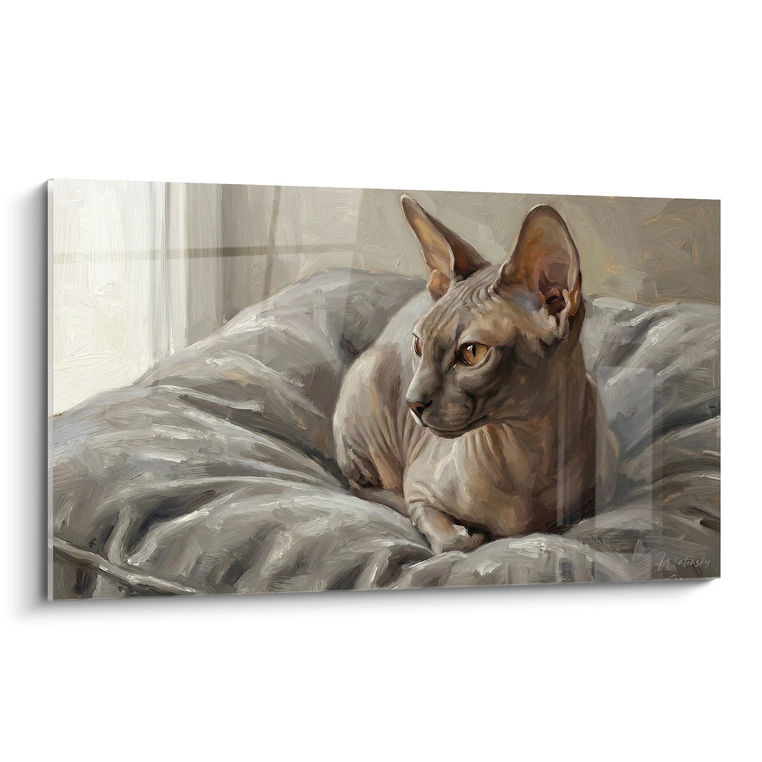 Quest'opera affascinante presenta un gatto sphynx dai toni grigi e beige, tranquillamente installato su cuscini soffici in un'atmosfera di serenità mattutina. Il felino senza pelo, caratteristico della razza sphynx, è rappresentato con un realismo affascinante che mette in valore la sua pelle corrugata e i suoi grandi occhi espressivi color ambra. L'artista ha magistralmente catturato la texture unica della pelle del gatto sphynx, alternando tra zone più scure e più chiare, creando un gioco di ombre e luci particolarmente riuscito. La posizione del gatto, leggermente voltato verso l'osservatore, emana un'impressione di fiducia e benessere. Lo sfondo suggerisce un interno luminoso con una finestra che lascia filtrare una dolce luce naturale, rinforzando l'atmosfera rasserenante della scena. Questo dipinto fa parte della nostra collezione esclusiva dedicata ai gatti Peterbald e alle razze di gatti senza pelo.