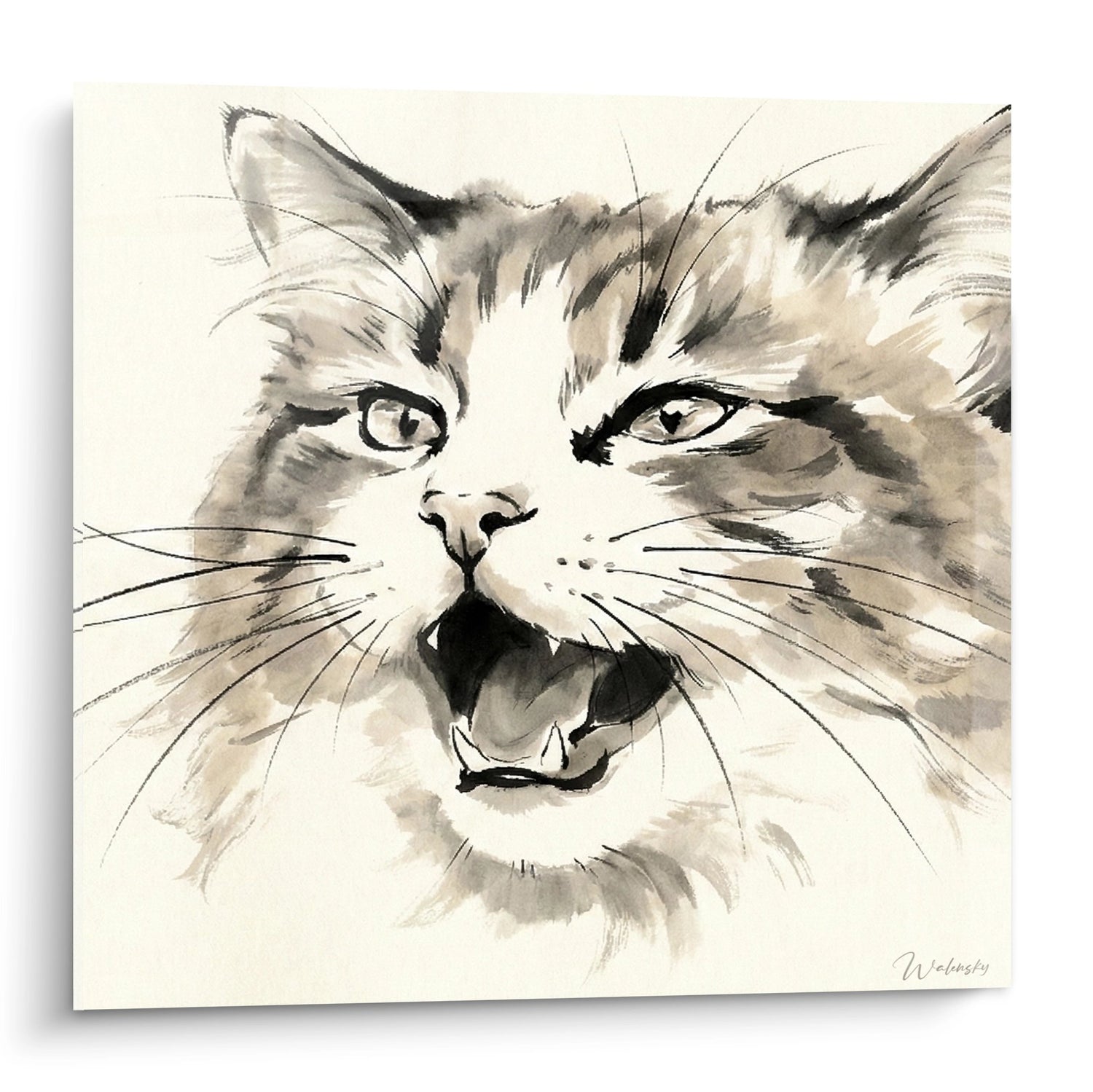 Questo stile ad acquerello si ispira ai grandi maestri dell'arte animaliera contemporanea, ricordando le tecniche di David Hockney nei suoi ritratti di animali o le opere di Giacomo Balla. L'approccio minimalista ed espressivo si inscrive nella tradizione dell'arte decorativa moderna, perfetta per una collezione di arte felina o una decorazione murale sofisticata.