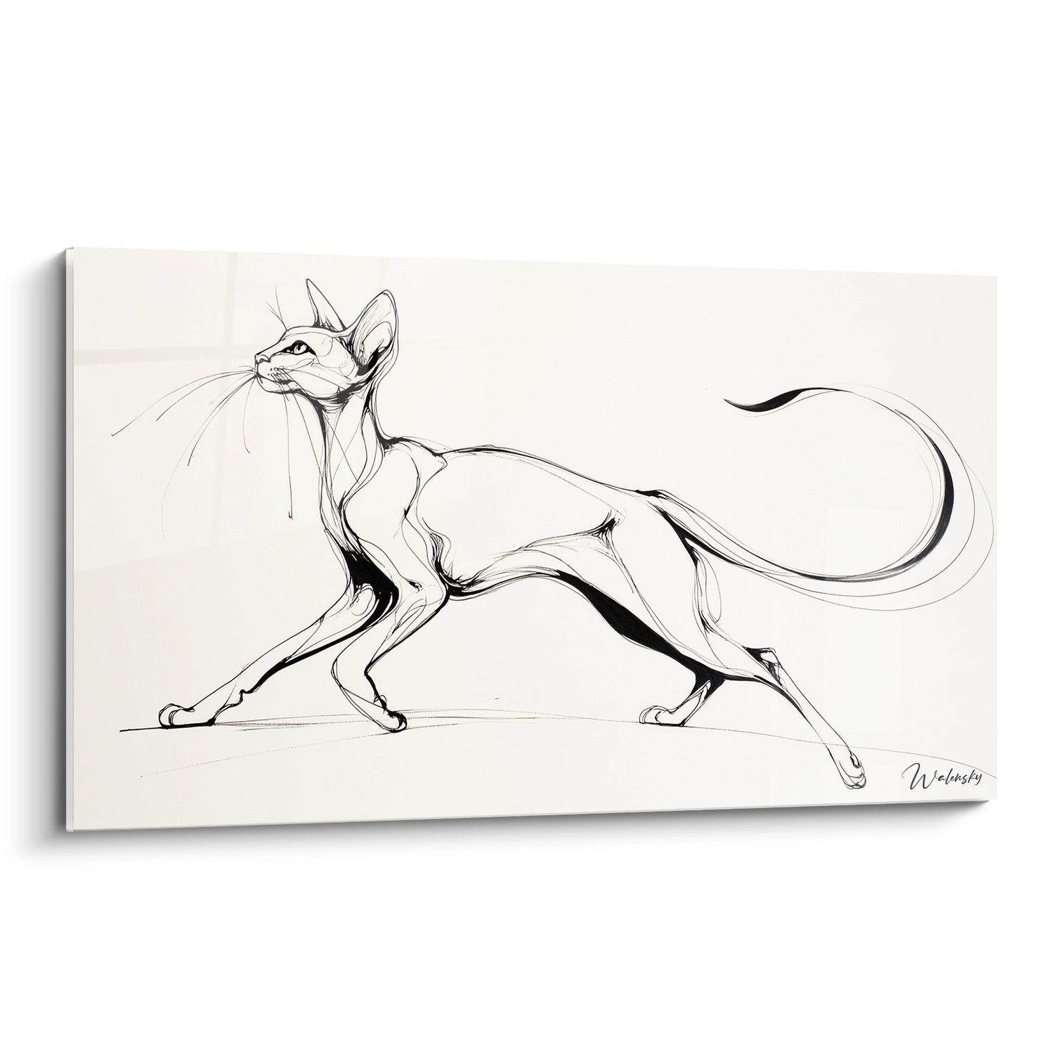 Quest'opera d'arte affascinante presenta un gatto elegante colto in un momento di pura grazia e movimento. Il disegno a tratto nero su sfondo beige crema rivela la sagoma slanciata di un felino in piena corsa, incarnando perfettamente l'agilità e la bellezza naturale dei gatti. L'artista ha saputo catturare con finezza ogni curva del corpo dell'animale, dalle orecchie dritte attentamente posizionate fino alla sua lunga coda ondeggiante che sembra sfidare la gravità. Le linee fluide ed espressive danno vita a questo gatto, creando una sensazione di movimento perpetuo che attira immediatamente lo sguardo. Questa rappresentazione minimalista ma potente evoca l'essenza stessa della felinità: l'eleganza, la flessibilità e questa grazia naturale che caratterizza i nostri compagni a quattro zampe. Lo stile essenziale dell'illustrazione permette a questo quadro di integrarsi armoniosamente in qualsiasi tipo di decorazione d'interni contemporanea.