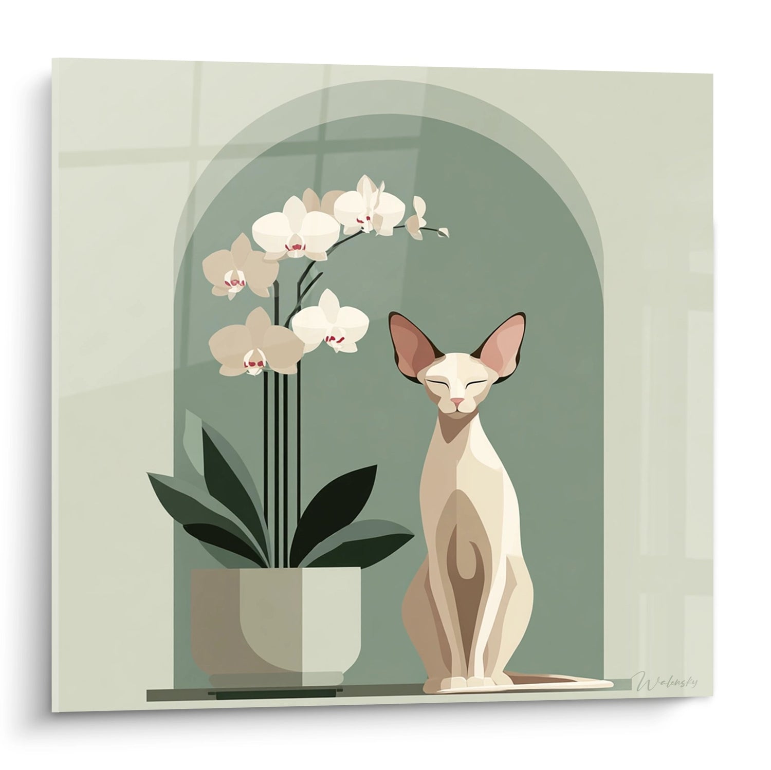 La palette cromatica di questa opera si basa su toni terrosi e tranquillizzanti: verde salvia, beige crema e bianco puro. Questi colori evocano la natura e la tranquillità, creando un equilibrio perfetto tra modernità e serenità. Il gatto Sphynx, simbolo di mistero e eleganza, si associa alle orchidee, rappresentando la bellezza raffinata e la spiritualità, per formare una composizione ricca di simbolismo.