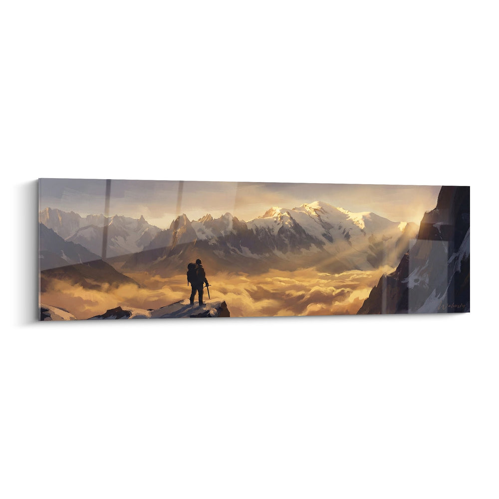Quest'opera affascinante cattura l'essenza stessa dell'alpinismo nel massiccio del Monte Bianco. Il quadro presenta un alpinista solitario che contempla un panorama grandioso di picchi innevati immersi in una luce dorata. La composizione panoramica valorizza l'immensità del paesaggio alpino, dove le nuvole sembrano danzare tra i picchi rocciosi. I toni caldi del tramonto contrastano magnificamente con la freschezza delle nevi eterne, creando un'atmosfera al contempo drammatica e tranquillizzante. Questa rappresentazione del Monte Bianco evoca l'avventura, il superamento di sé e la comunione con la natura selvaggia. L'artista ha saputo catturare questo momento sospeso dove l'uomo si confronta con l'immensità della montagna, ricordando le grandi spedizioni alpine e lo spirito pionieristico dei primi conquistatori delle Alpi.