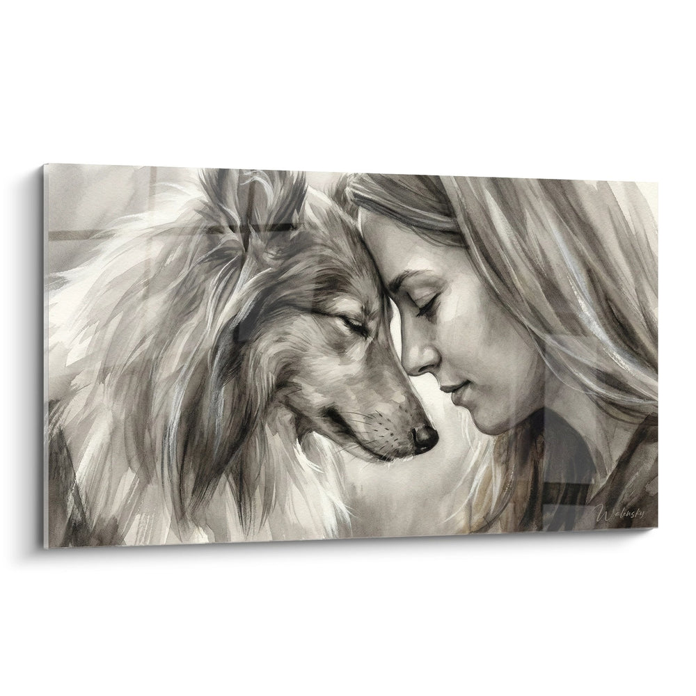 L'artista ha creato un gioco sottile tra le trame bionde dei capelli umani e il mantello chiaro del compagno canino. Questa armonia cromatica unisce visivamente i due protagonisti, come se le loro essenze si mescolassero. Questa fusione dei toni dorati simboleggia l'unione profonda che li lega al di là delle specie.