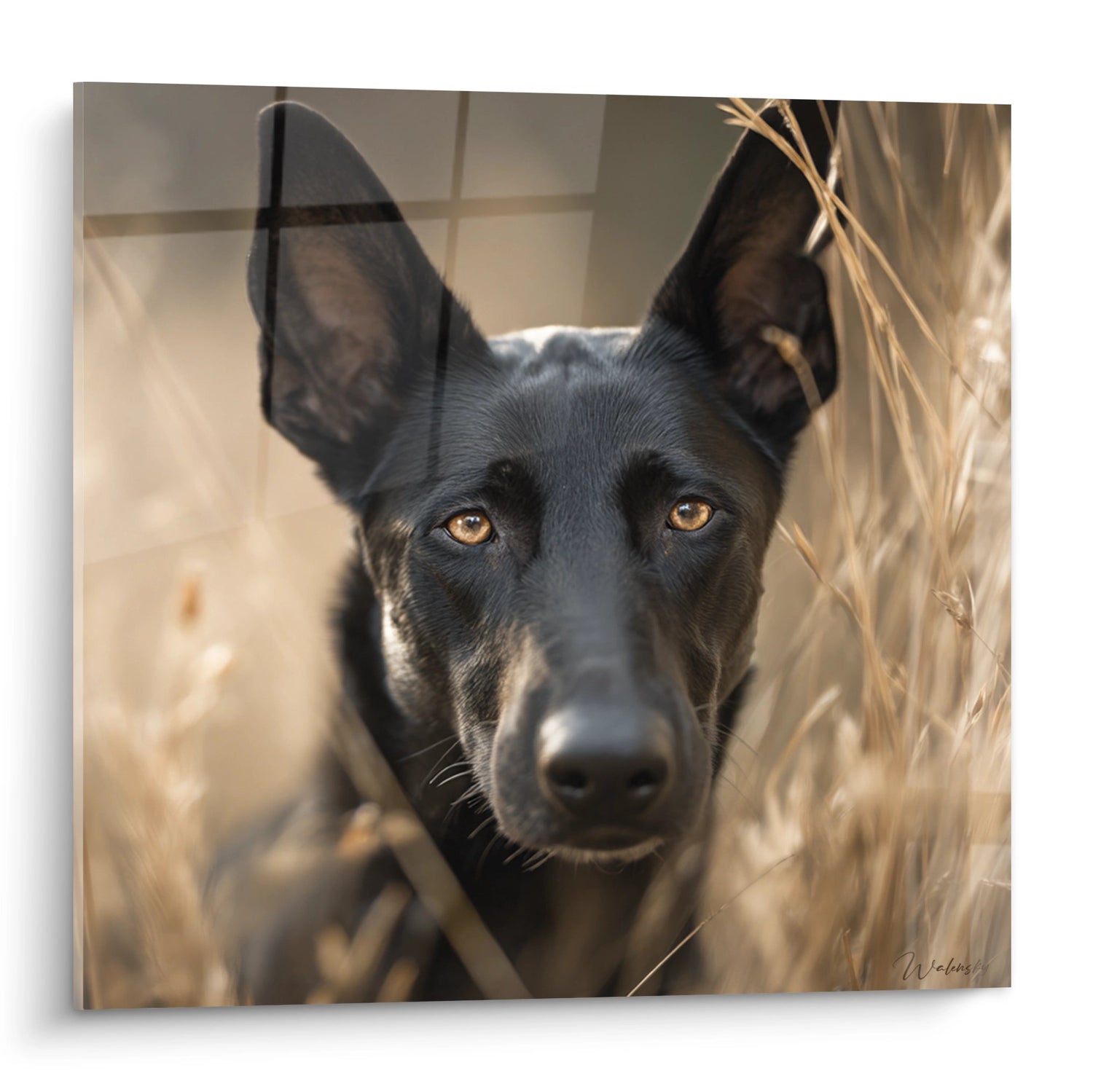 Lo sguardo penetrante di questo cane emana un'intelligenza straordinaria e una profonda connessione emotiva. I suoi occhi ambrati, meravigliosamente valorizzati dall'illuminazione naturale, esprimono sia la vigilanza caratteristica della razza che una dolcezza toccante. Questa espressione affascinante trasforma ogni sguardo al quadro in un momento di emozione autentica.