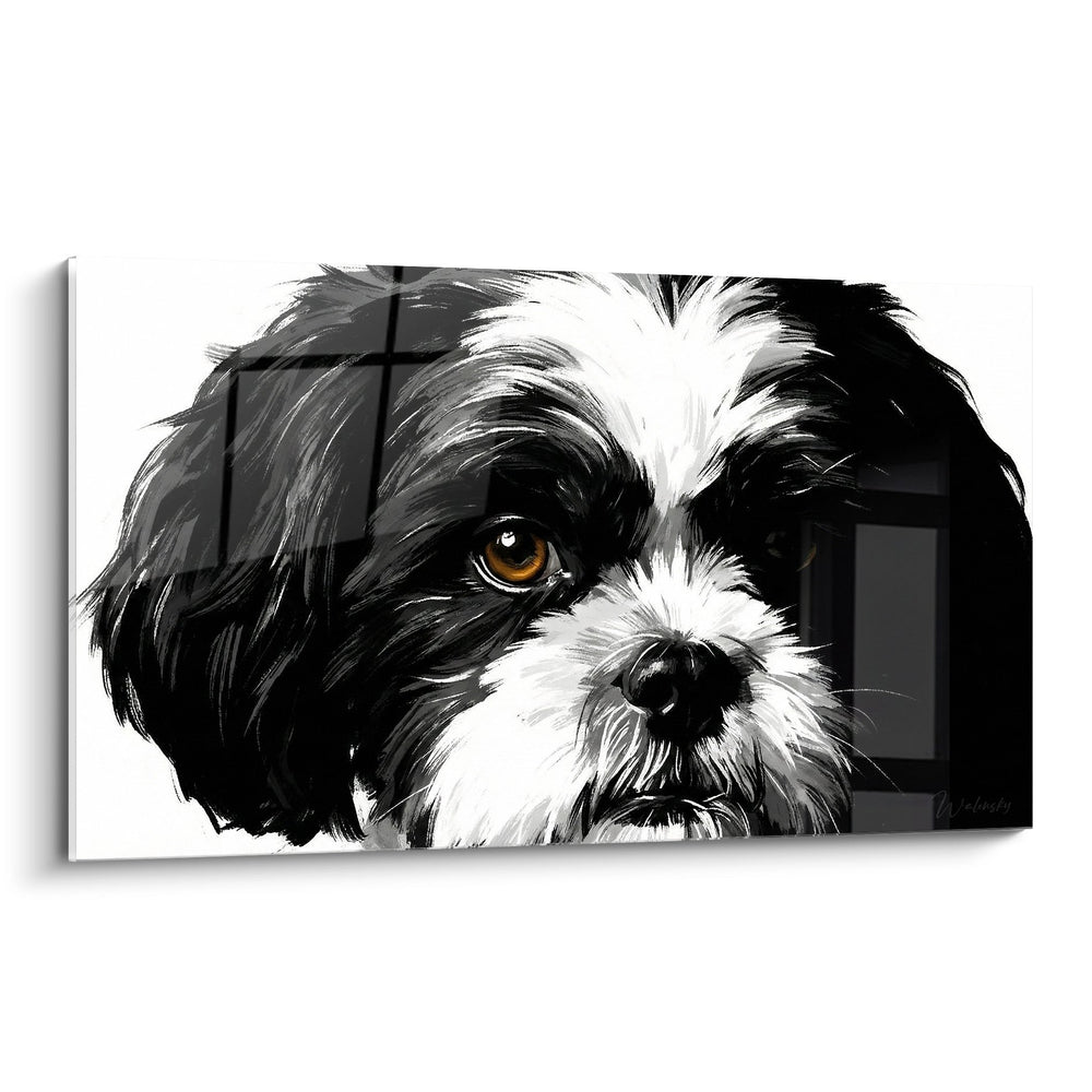 Quadro Ritratto Canino Bianco e Nero con Occhi Dorati - Sguardo Intenso - Edizione Shih Tzu