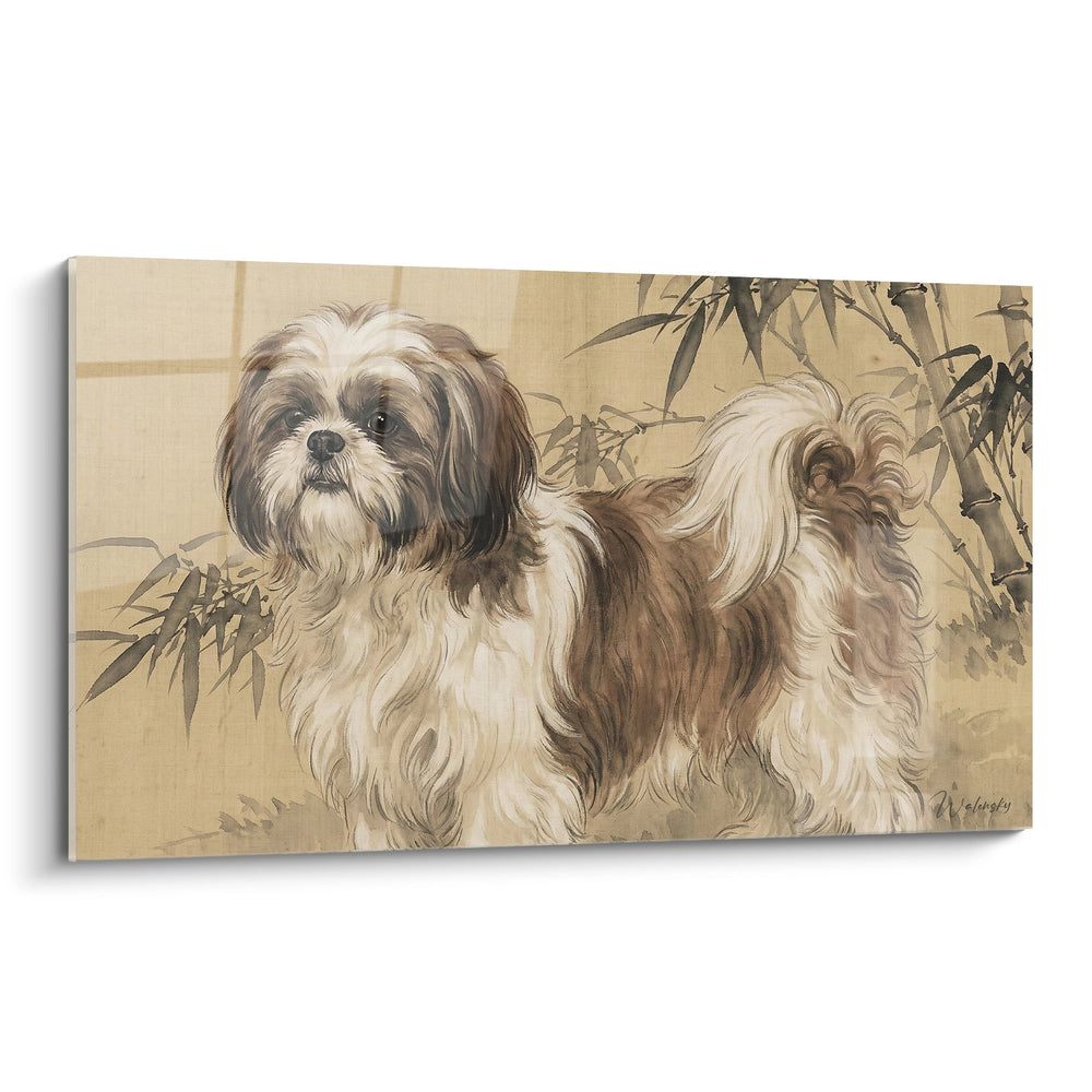 Nella tradizione artistica asiatica, i bambù rappresentano la flessibilità, la saggezza e la longevità. La loro presenza accanto allo Shih Tzu, razza originaria dell'impero cinese, rafforza l'autenticità culturale di questa opera. Questa associazione crea un dialogo visivo tra l'animale domestico imperiale e un simbolo vegetale profondamente radicato nella filosofia orientale, evocando l'armonia tra l'uomo e la natura.