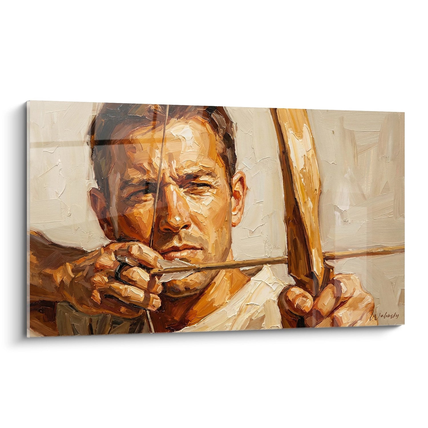 Quest'opera affascinante cattura l'essenza stessa del tiro con l'arco attraverso il ritratto di un arciere in piena concentrazione. Realizzata in stile impressionista moderno, la pittura rivela ogni dettaglio della gestualità perfetta: la posizione delle mani sull'arco, la tensione della corda, e soprattutto questo sguardo intenso fisso sul bersaglio. L'artista ha saputo trasmettere tutta la potenza e la grazia di questa disciplina millenaria. I colpi di pennello espressivi danno vita alla muscolatura dell'arciere, rivelando la forza fisica necessaria alla pratica del tiro con l'arco. Questa rappresentazione artistica onora l'eredità ancestrale dell'archeologia pur offrendo una visione contemporanea di questo sport di precisione. L'opera cattura perfettamente l'istante sospeso che precede il tiro, quel momento in cui tutta l'energia si concentra prima della liberazione della freccia.