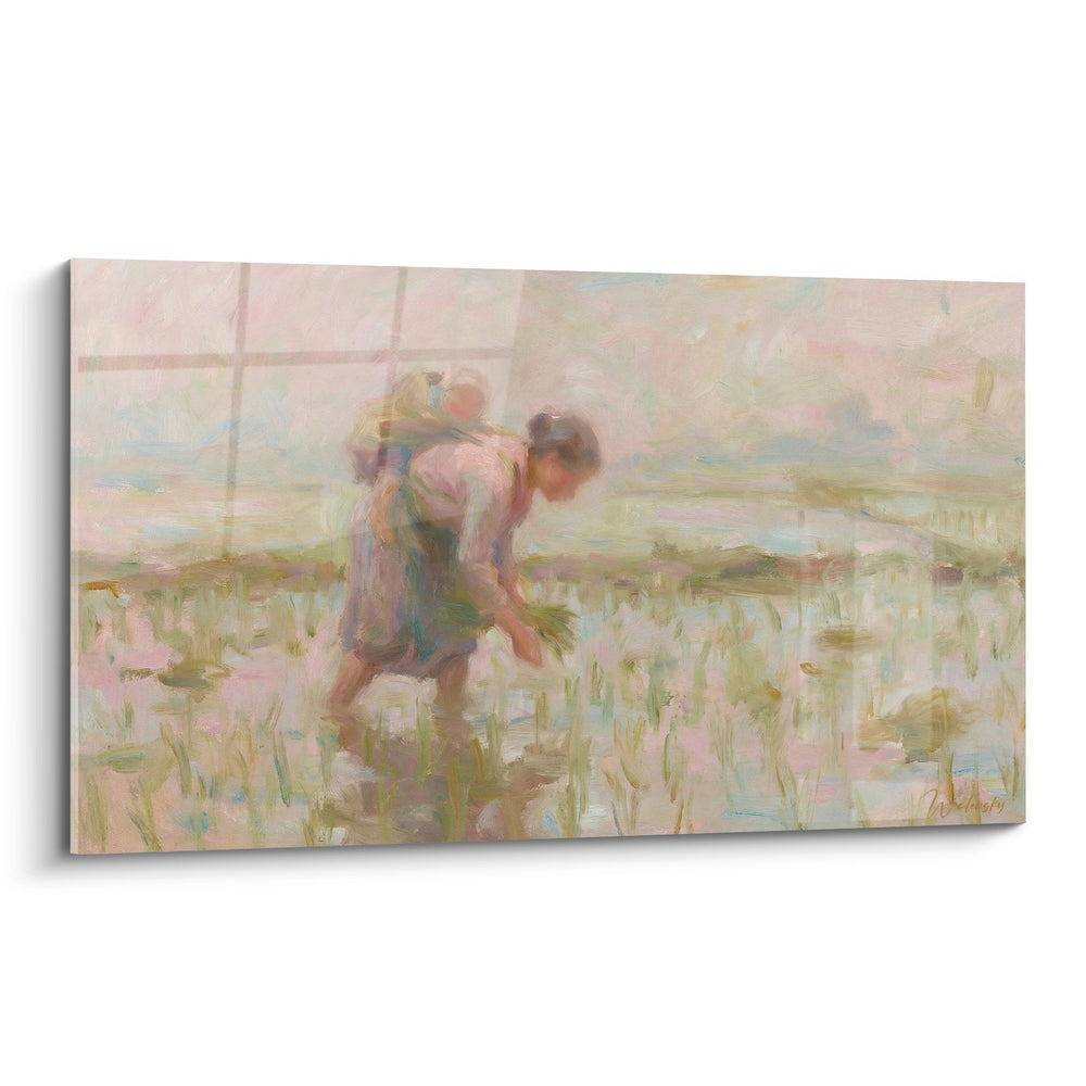 Questa immagine cattura l'essenza stessa del ciclo della natura e del lavoro umano in armonia. Le figure piegate illustrano la pazienza e la perseveranza necessarie alla coltivazione del riso, simbolo di prosperità in molte culture. La tecnica impressionista utilizzata rafforza questa connessione senza tempo tra l'uomo e la terra, evocando i cicli eterni di semina e raccolto.