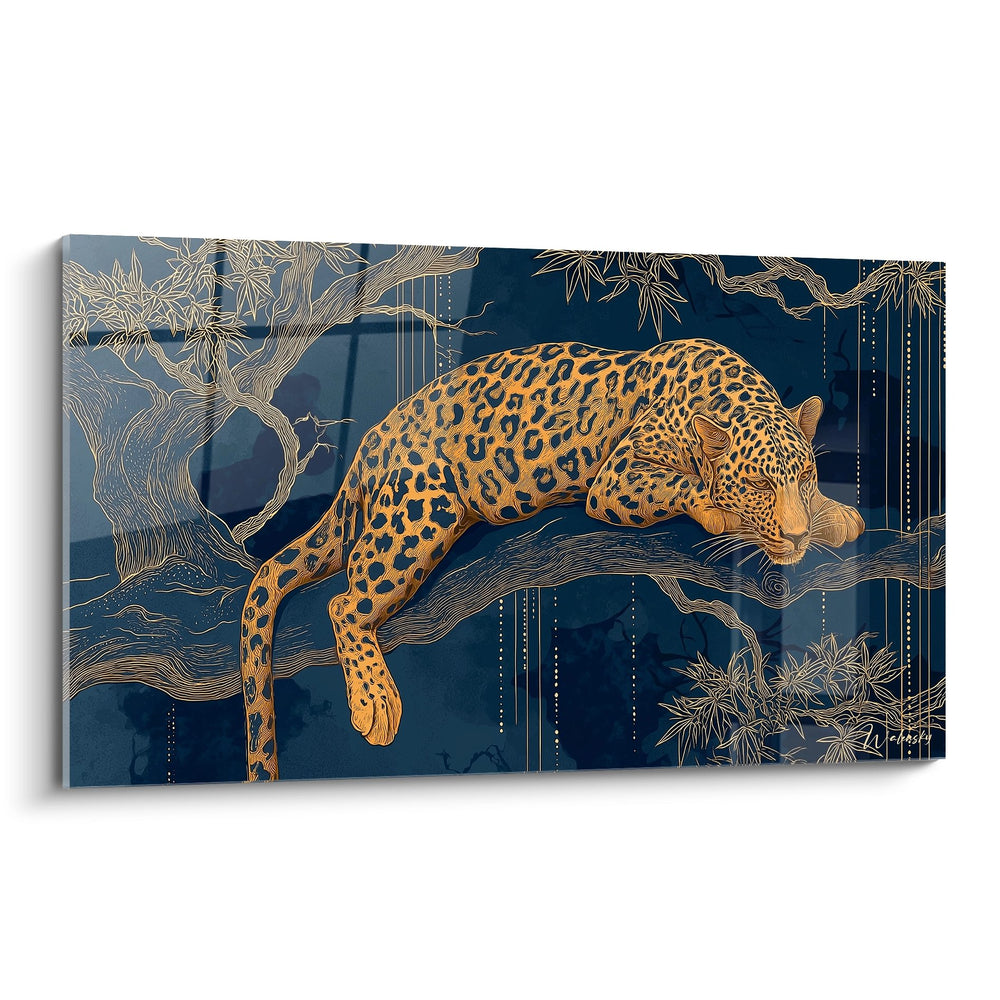 La tavolozza cromatica associa armoniosamente il caldo dorato del leopardo al blu marino profondo dello sfondo. Questa combinazione evoca il lusso e la serenità, caratteristiche dell'Art déco. Il leopardo simboleggia la forza, l'indipendenza e la nobiltà selvaggia, mentre i motivi geometrici dorati rappresentano l'eleganza e la modernità.