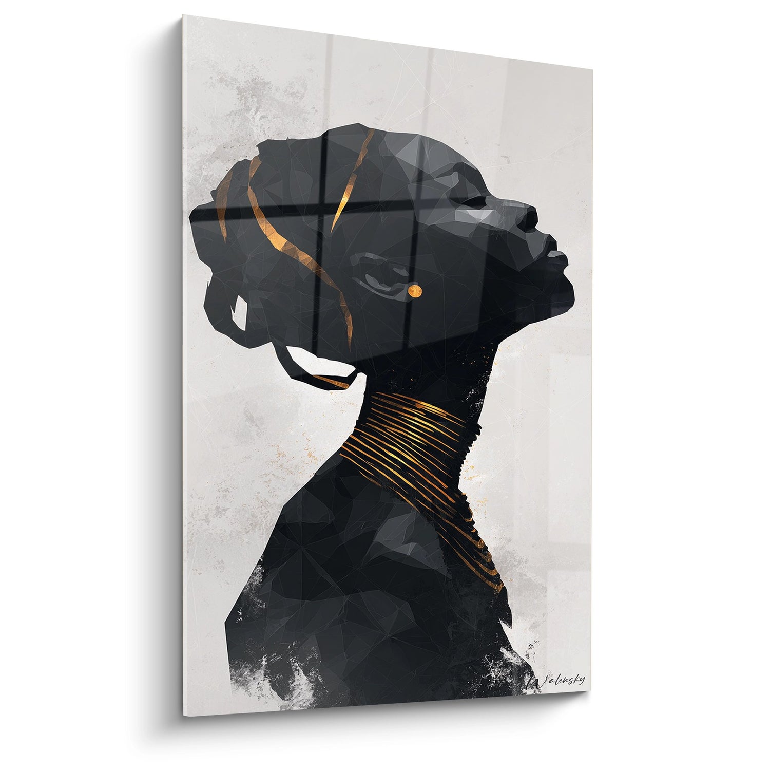 La tavolozza cromatica dominata da neri profondi e grigi simboleggia la forza e l'eleganza senza tempo. I tocchi dorati rappresentano la ricchezza culturale e spirituale dell'Africa, ricordando gli ornamenti tradizionali e l'oro dei regni antichi. Il profilo rivolto a destra suggerisce uno sguardo verso il futuro.