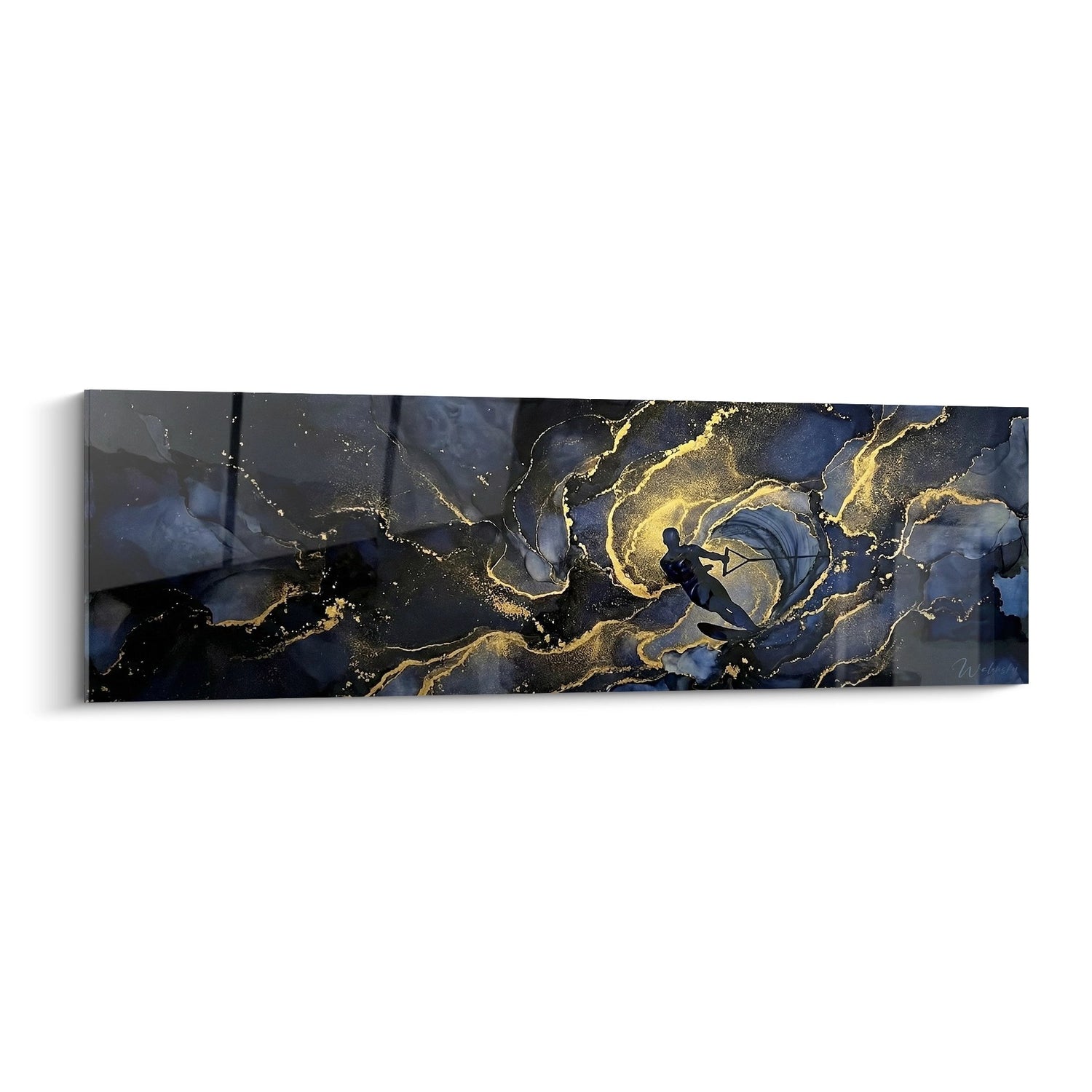 Questo quadro astratto panoramico cattura l'essenza stessa dell'oceano attraverso un sottile mélange di blu profondi e dorature scintillanti. L'opera presenta forme fluide che evocano naturalmente i movimenti delle onde e i vortici dell'acqua in movimento. Le sfumature di blu navy, blu notte e blu grigio si mescolano armoniosamente con venature dorate che serpeggianoattraverso la composizione, creando un effetto di lusso e sofisticatezza. Questo pezzo murale s'ispira all'universo acquatico e dello sci nautico, ricordando le sensazioni di glissa sull'acqua e la bellezza dei paesaggi marini. Le texture organiche e i contrasti cromatici apportano una dimensione contemporanea al vostro interno mantenendo una connessione profonda con l'elemento acquatico.