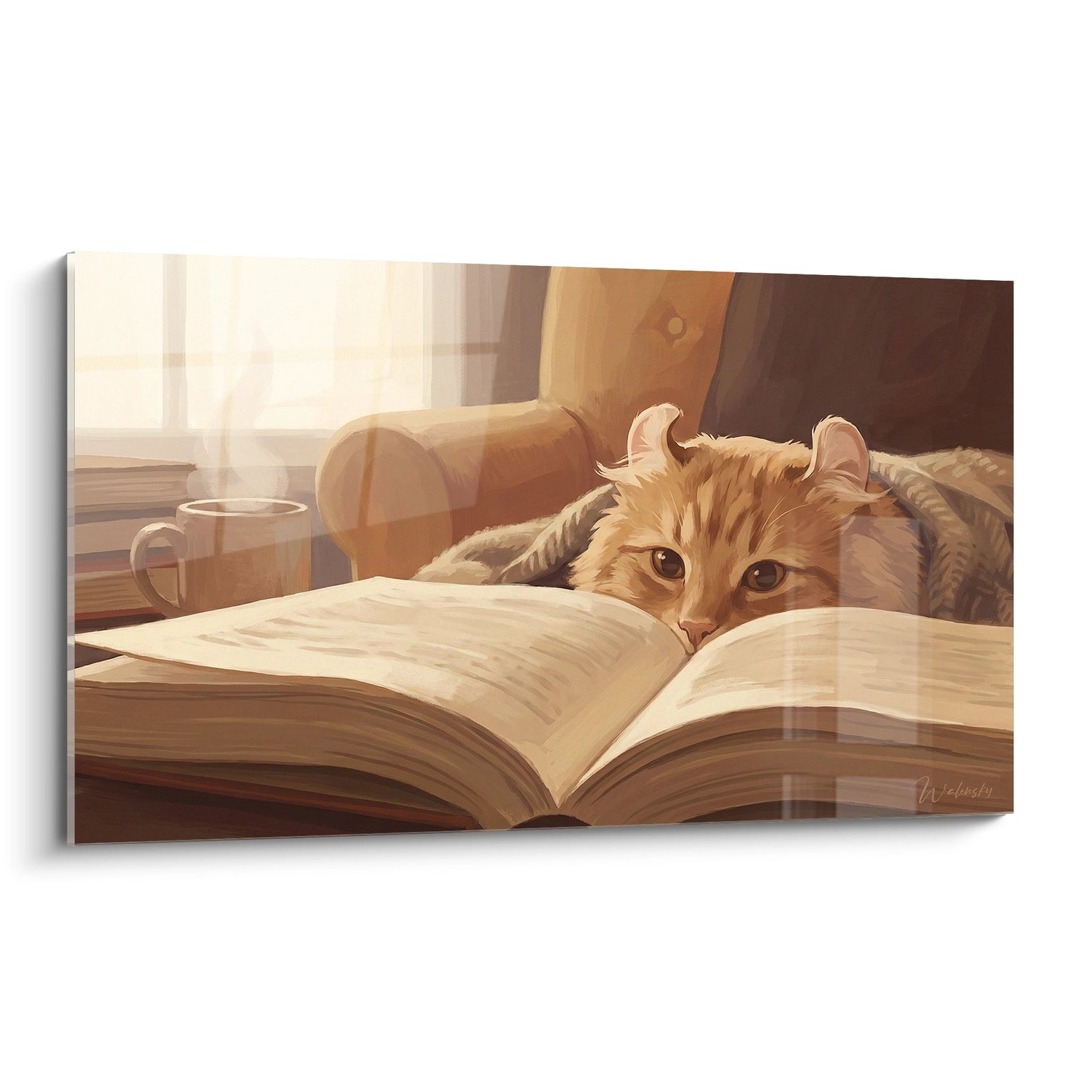 Incorporer ce tableau dans votre salon peut renforcer le côté chaleureux et amical de l'espace. Sa représentation d'un chat qui se prélasse sur un livre évoque le confort et la convivialité, parfait pour accueillir vos invités.
