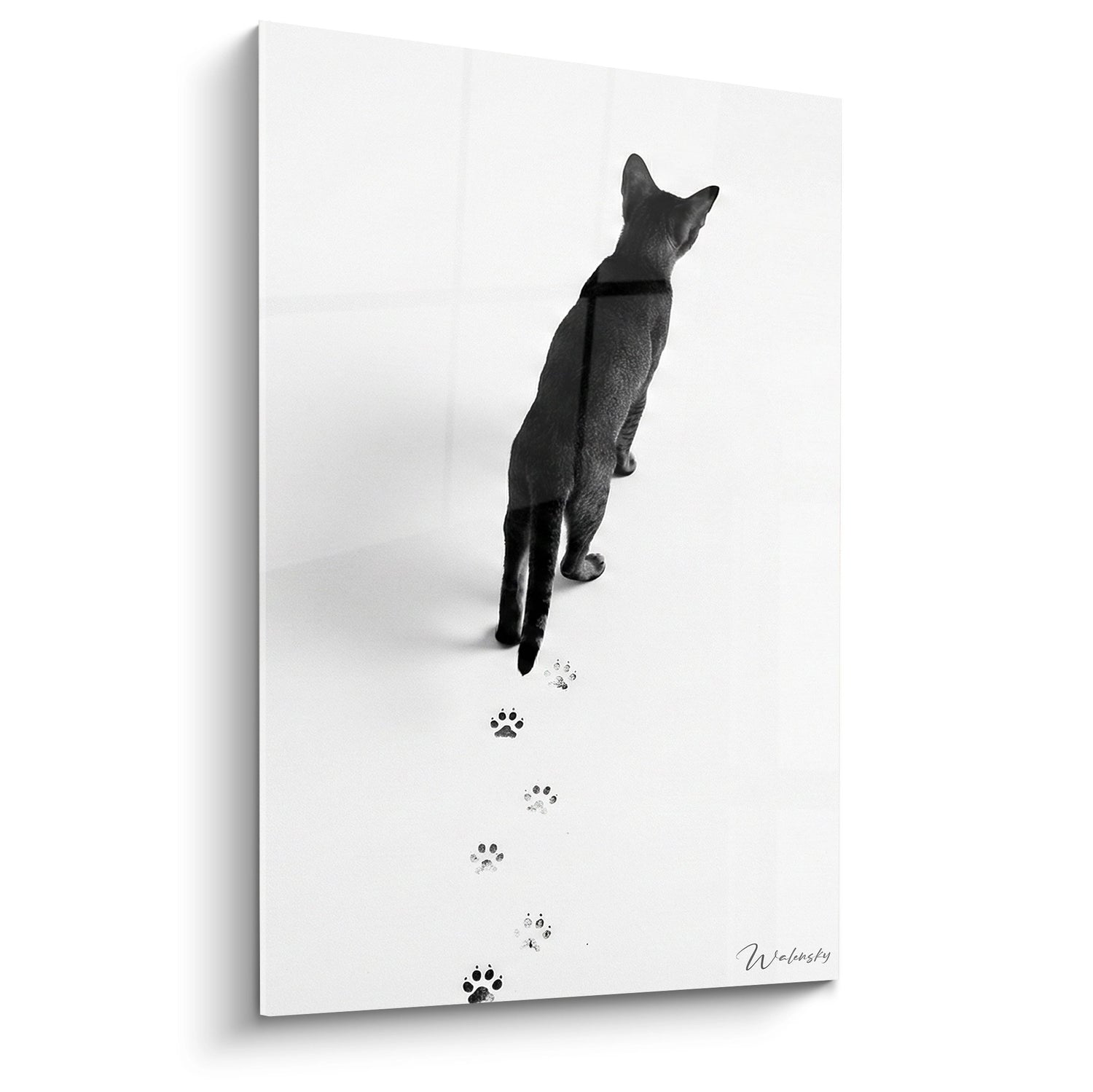 Dit kunstwerk toont een kat in zwart-wit, vergezeld van delicate pootafdrukken op een lichte achtergrond. Deze elementen creëren een elegant contrast en wekken een gevoel van nieuwsgierigheid op.