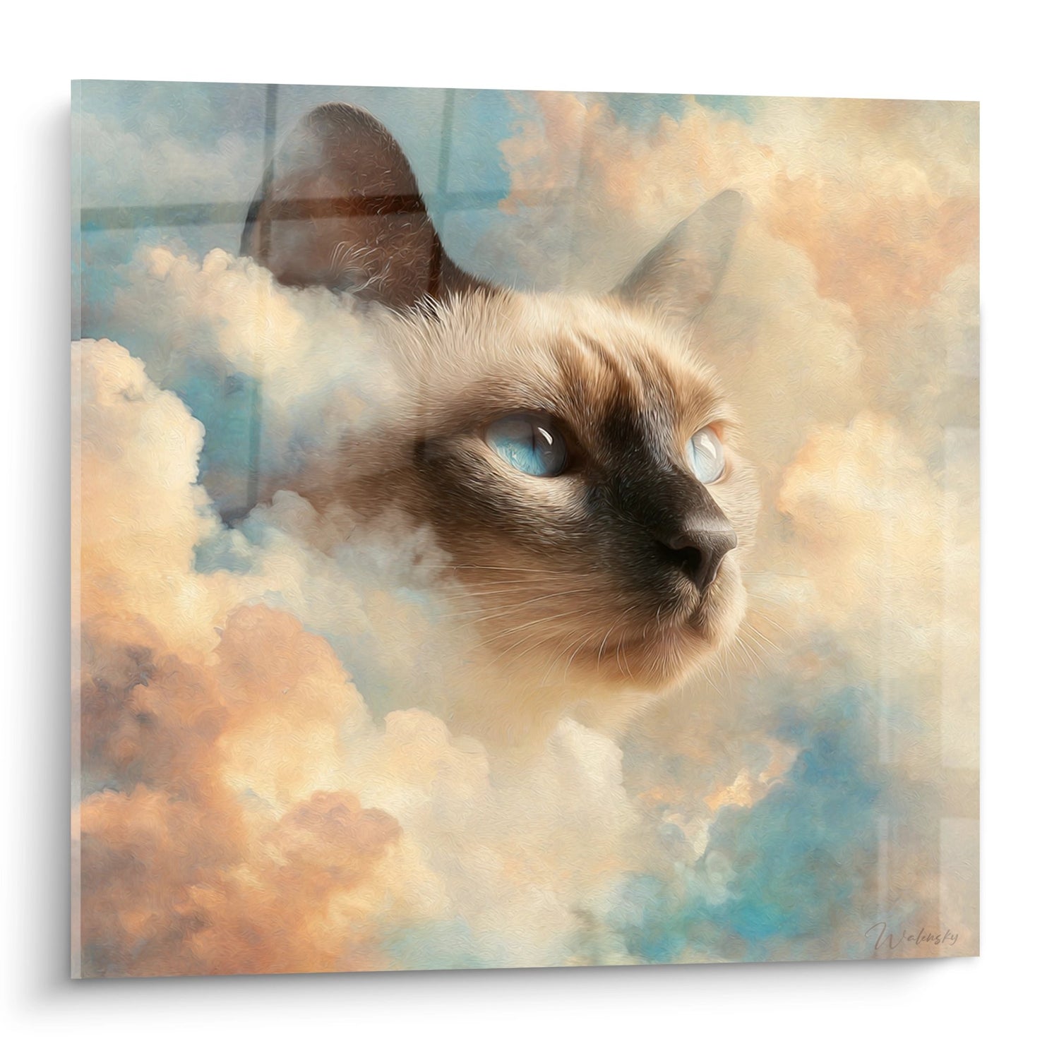 Ce tableau présente un chat Tonkinese majestueux dont la tête émerge de doux nuages colorés. Les couleurs dominantes sont un mélange de crème et de nuances bleues, créant une harmonie visuelle apaisante. Le jeu de lumière donne une impression de profondeur, tandis que la texture nuageuse rend l'œuvre à la fois vivante et empreinte de mystère. La composition équilibrée attire le regard vers les détails délicats de l'animal.
