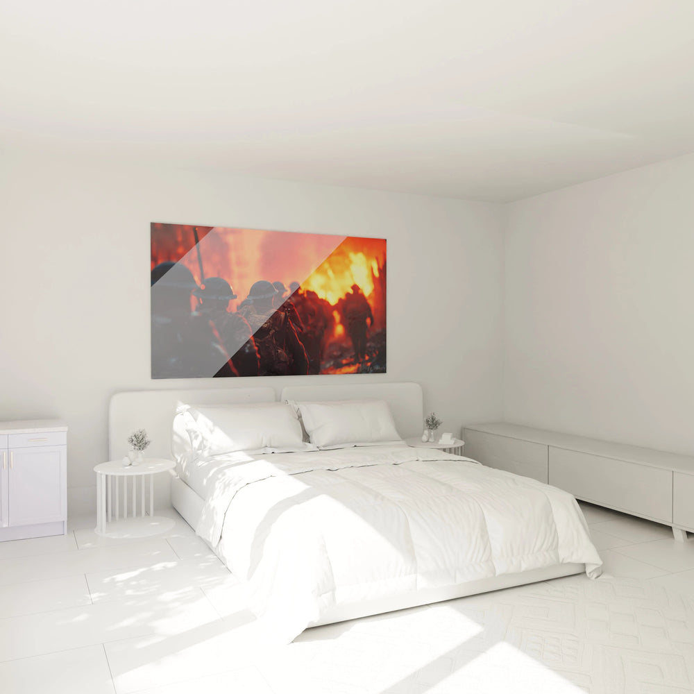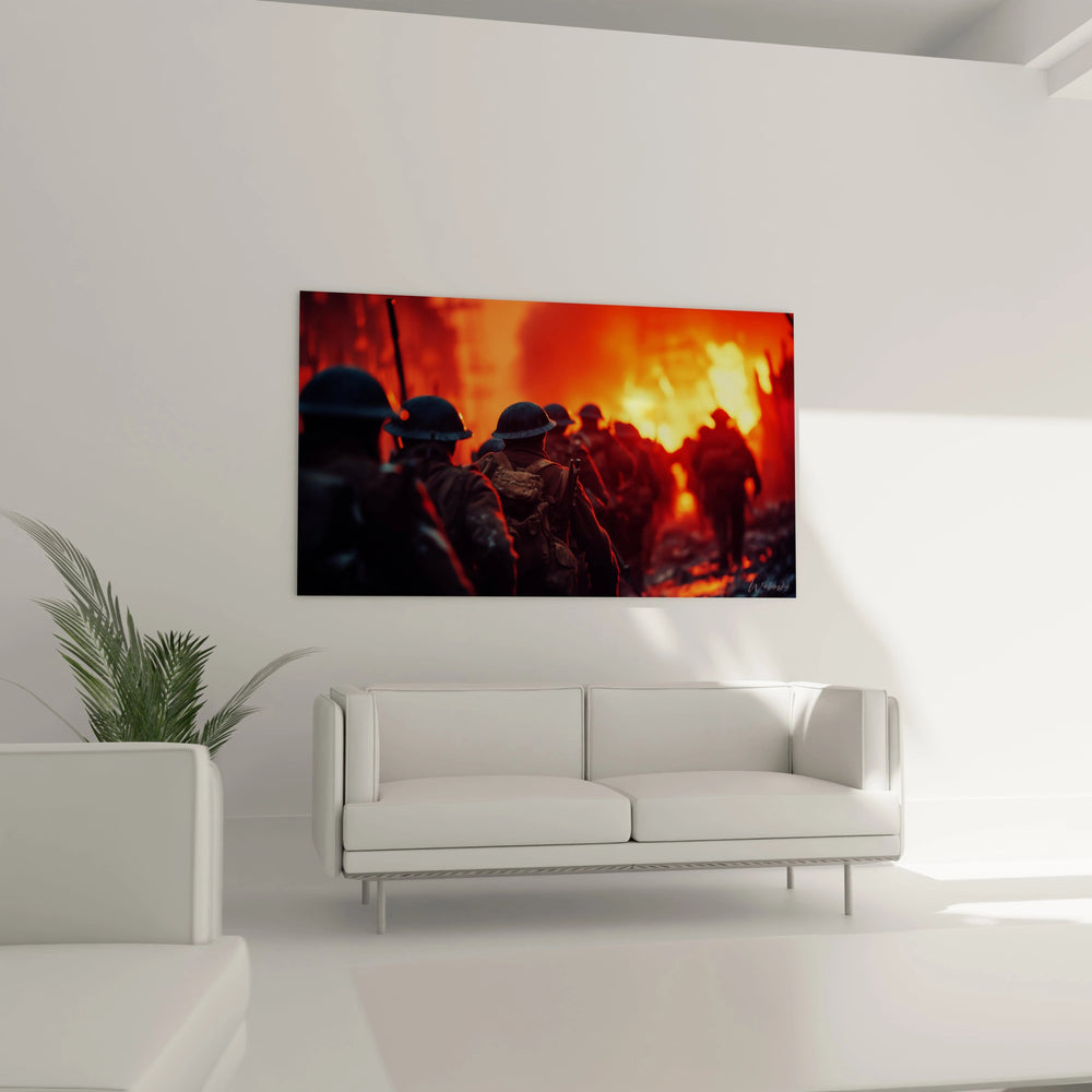 La palette chromatique de ce tableau soldats rouge orangé s'articule autour d'une gamme chaleureuse dominée par les tons rouge, orange et jaune. Les nuances orangées du ciel créent un dégradé subtil du rouge profond vers le jaune lumineux, évoquant un coucher de soleil ou des flammes. Cette art mural guerre atmosphérique exploite brillamment les contrastes entre les teintes chaudes de l'arrière-plan et les tons plus froids des uniformes militaires.