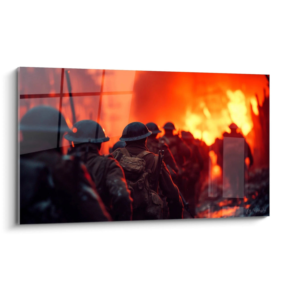 Cette œuvre saisissante nous plonge immédiatement dans l'atmosphère dramatique d'une scène militaire historique. Le tableau soldats présente un groupe de combattants en silhouettes sombres, contrastant puissamment avec un arrière-plan embrasé aux teintes rouge-orange intenses. La composition révèle des soldats casqués en position d'observation, créant une tension visuelle palpable. Ce tableau soldats crépuscule dramatique capture l'essence même du conflit avec une intensité émotionnelle remarquable. Les uniformes militaires et les casques caractéristiques se détachent nettement contre le ciel incandescent, conférant à cette décoration murale soldats une puissance narrative exceptionnelle qui interpelle immédiatement le spectateur.