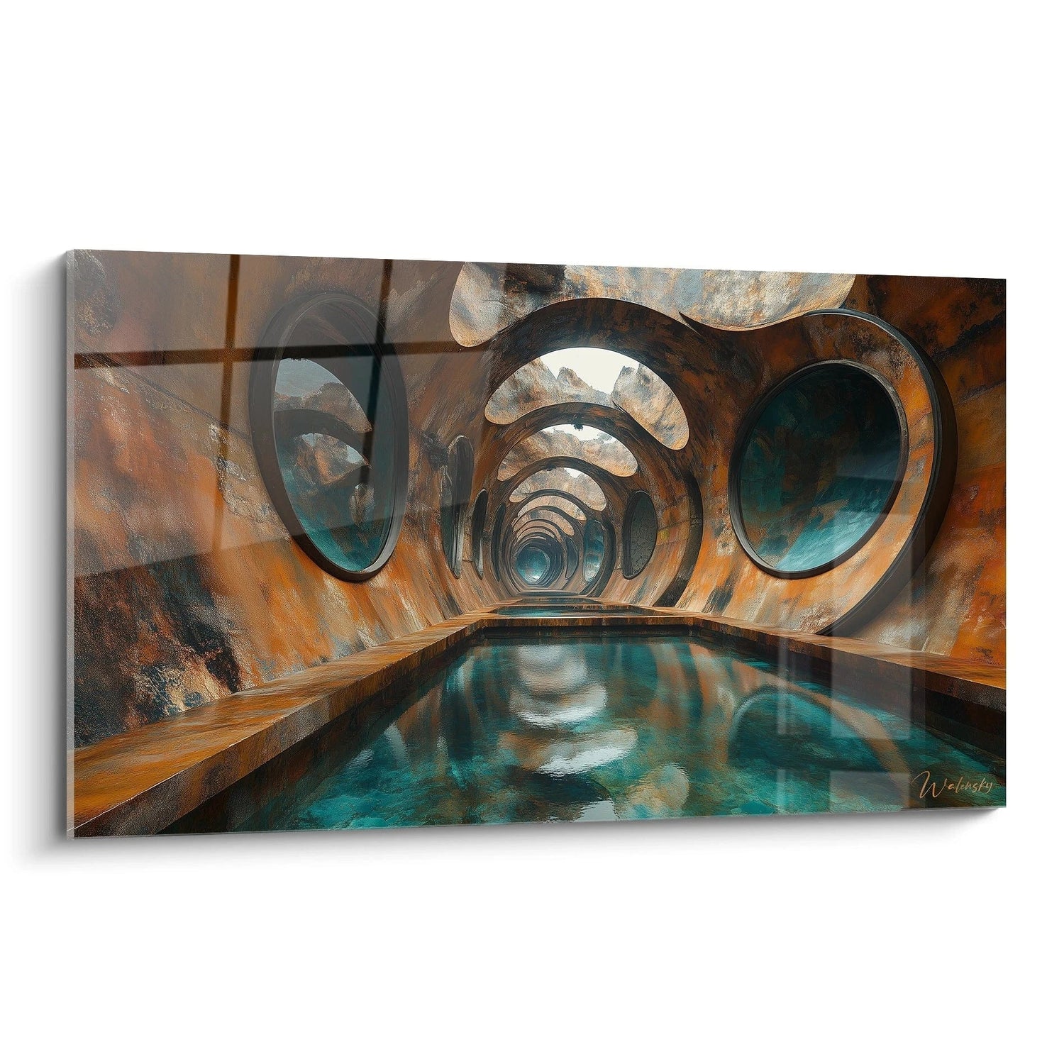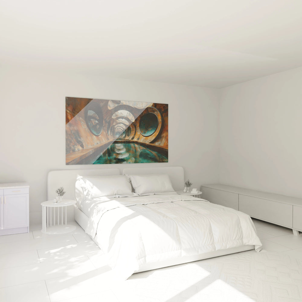 Ce tableau tunnel révèle une perspective architecturale saisissante qui guide l'œil vers l'infini. L'œuvre présente un corridor souterrain aux formes organiques où se mélangent harmonieusement les tons cuivrés et turquoise. La composition de ce tableau tunnel perspectif crée une sensation de voyage à travers des dimensions parallèles. Les reflets aquatiques au premier plan contrastent magnifiquement avec les structures géométriques des voûtes successives. Cette décoration murale tunnel capture immédiatement l'attention par son réalisme troublant et son invitation au voyage mental.