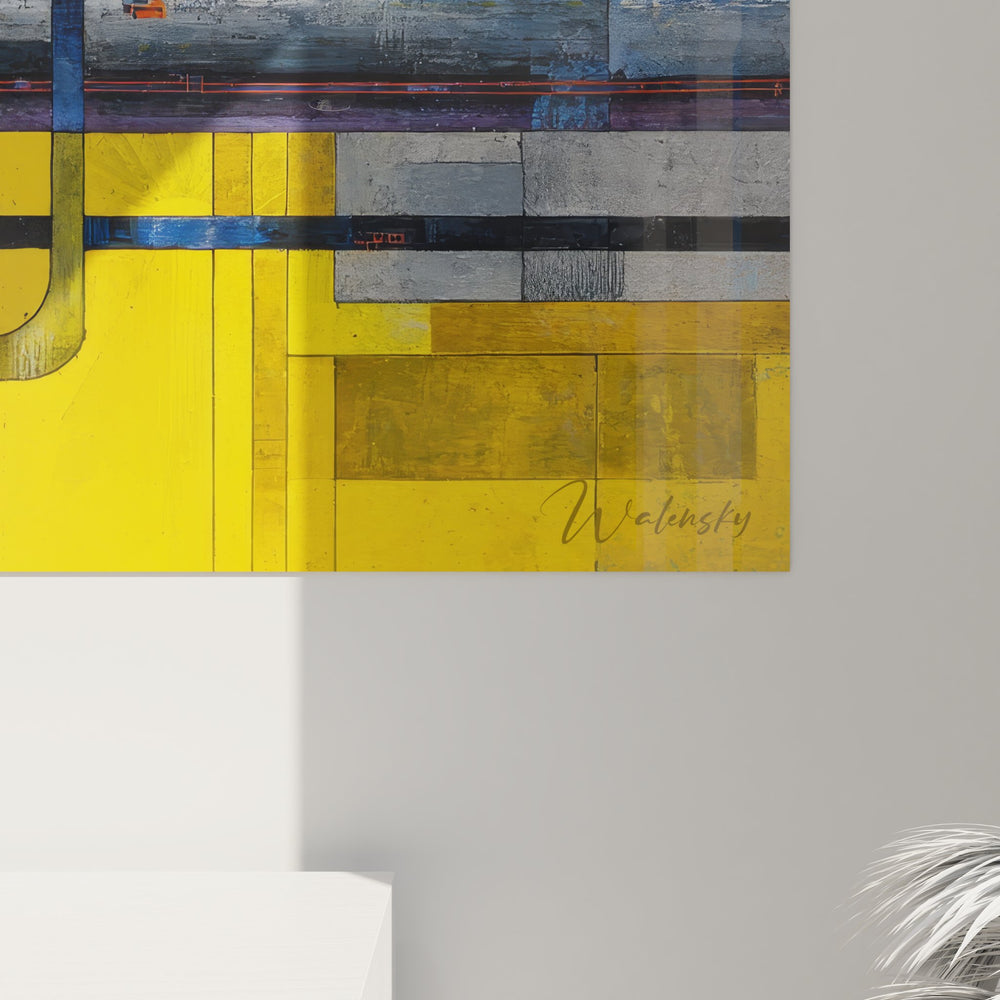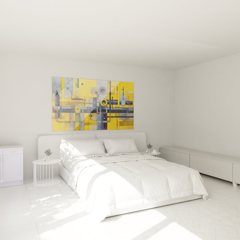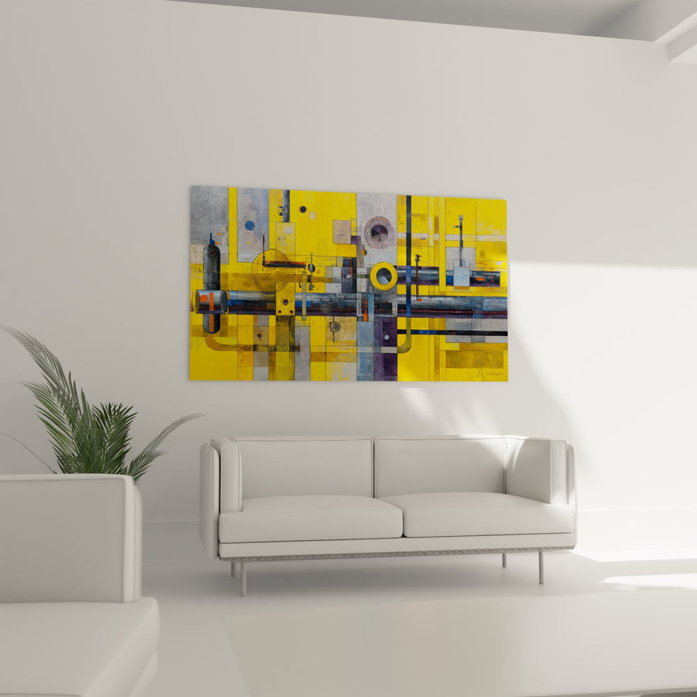La dominante jaune vif symbolise l'énergie industrielle et la productivité, contrastant avec les tons gris métalliques qui évoquent l'acier and les matériaux industriels. Cette œuvre d'art industriel utilise également des nuances de bleu et d'orange qui apportent dynamisme et chaleur à l'ensemble. Les superpositions chromatiques créent une profondeur architecturale qui transforme ce tableau moderne mécanique en véritable fenêtre sur un monde industriel poétique.