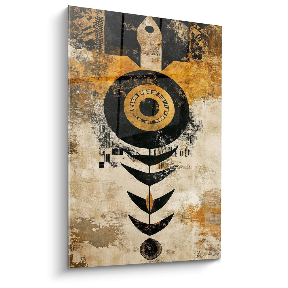Cette œuvre d'art contemporain présente une composition géométrique fascinante où dominent les tons dorés et noirs. Le tableau géométrie révèle immédiatement son caractère mystique à travers un grand cercle central orné de motifs concentriques. Les formes abstraites s'organisent verticalement, créant un tableau abstrait contemporain doré d'une rare intensité visuelle. L'œil est immédiatement captivé par cette structure verticale qui évoque à la fois des symboles ancestraux et une esthétique moderne raffinée.